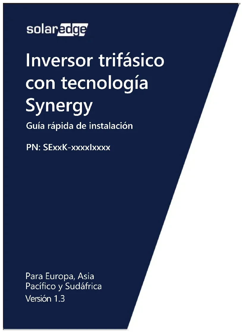 Indicazioni LED 18Informazioni di contatto del Supporto Se avete problemi tecnici relativi a prodotti SolarEdge, vi preghiamo di contattateci: https://www.solaredge.com/it/service/support Soggetto a modifiche senza preavviso. Copyright © SolarEdge Inc. Tutti i diritti riservati. Marzo 2021.Inversor trifásico con tecnología Synergy Guía rápida de instalación PN: SExxK-xxxxIxxxx Para Europa, Asia Pacífico y Sudáfrica Versión 1.3NOTA Este símbolo indica información para ayudar al usuario a hacer un uso óptimo del producto. Este símbolo aparece en los puntos de conexión a tierra en los manuales y en el equipo de SolarEdge. ¡PRECAUCIÓN! Supone un peligro. Llama la atención sobre un procedimiento que, si no se realiza correctamente o no se cumple, podría provocar daños o la destrucción del producto. No proceder más allá de una señal de precaución hasta que las condiciones indicadas se entiendan y cumplan completamente. Mover el interruptor de CA del cuadro de alimentación principal de ON a OFF y esperar 5 minutos ¡ADVERTENCIA! Supone un peligro. Llama la atención sobre un procedimiento que, si no se realiza correctamente o no se cumple, podría provocar lesiones o pérdida de vidas humanas. No continúe tras una nota de advertencia hasta que haya entendido las condiciones indicadas y se cumplan totalmente. Mover el interruptor de seguridad de CC del Synergy Manager de ON a OFF y esperar 5 minutos (Aplicable solo para los modelos con interruptor de seguridad de CC) No cortar los conectores de los cables