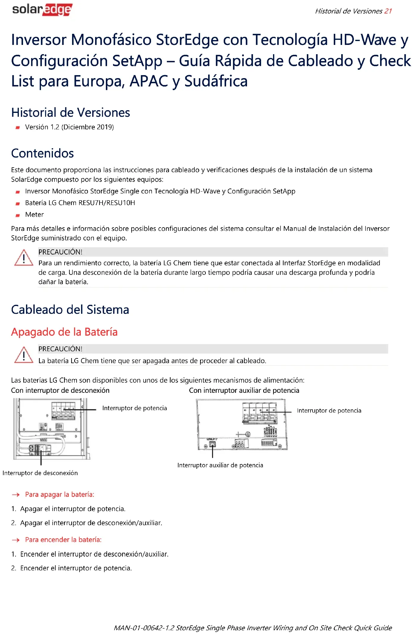 Para apagar la batería: 1. Apagar el interruptor de potencia. 2. Apagar el interruptor de desconexión/auxiliar. Para encender la batería: 1. Encender el interruptor de desconexión/auxiliar. 2. Encender el interruptor de potencia. Interruptor auxiliar de potencia Interruptor de potencia Interruptor de potencia Interruptor de desconexión22 Cableado del Sistema MAN-01-00642-1.2 StorEdge Single Phase Inverter Wiring and On Site Check Quick Guide Conectar los Componentes del Sistema Conectar los componentes del sistema como indicado en los esquemas a continuación. Prestar especial atención a: Tipo de cables Configuraciones DIP switch B A G En Inverter Energy Meter B- <> B- and A+ <> A+ on the same twisted pair LG Chem Battery RS485_H <> A+ and RS485_L <> B- on the same twisted pair ENABLE_H <> EnEN_GND <> G Left DIP > OFF DIP 2 > ON 3-wire shielded twisted pair,