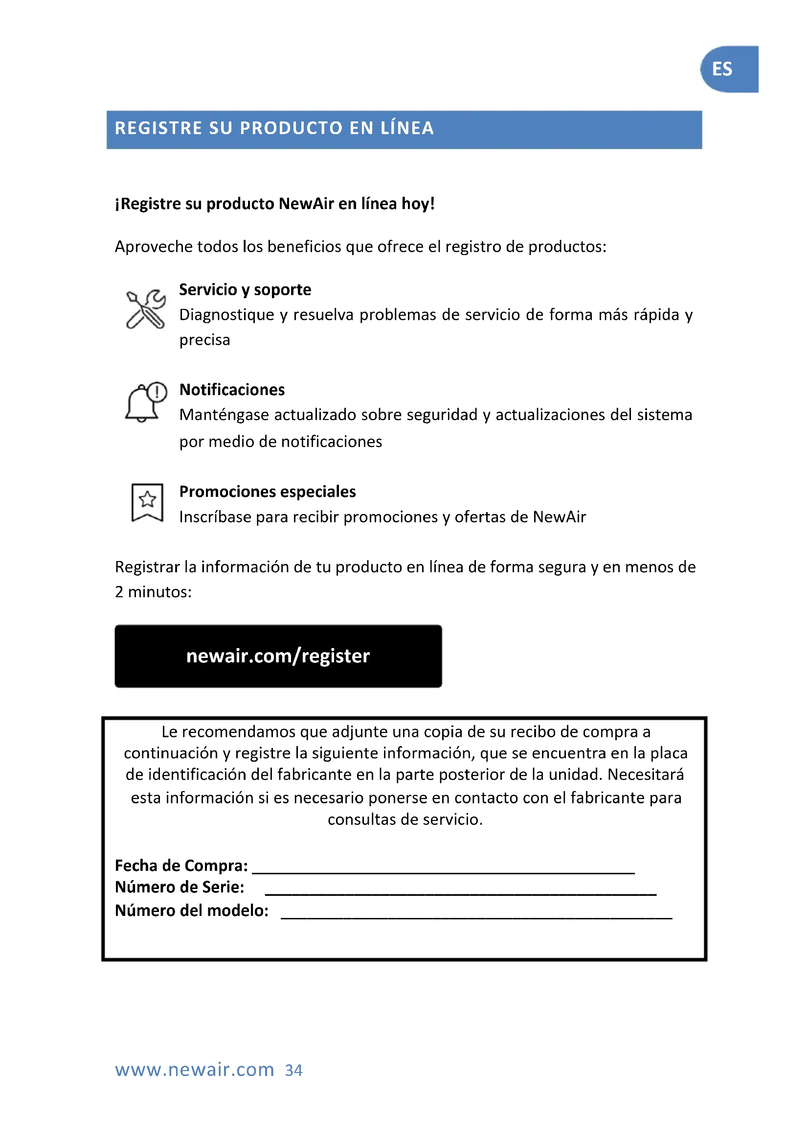 ¡Registre su producto NewAir en línea hoy! Aproveche todos los beneficios que ofrece el registro de productos: Servicio y soporte Diagnostique y resuelva problemas de servicio de forma más rápida y precisa Notificaciones Manténgase actualizado sobre seguridad y actualizaciones del sistema por medio de notificaciones Promociones especiales Inscríbase para recibir promociones y ofertas de NewAir Registrar la información de tu producto en línea de forma segura y en menos de 2 minutos: