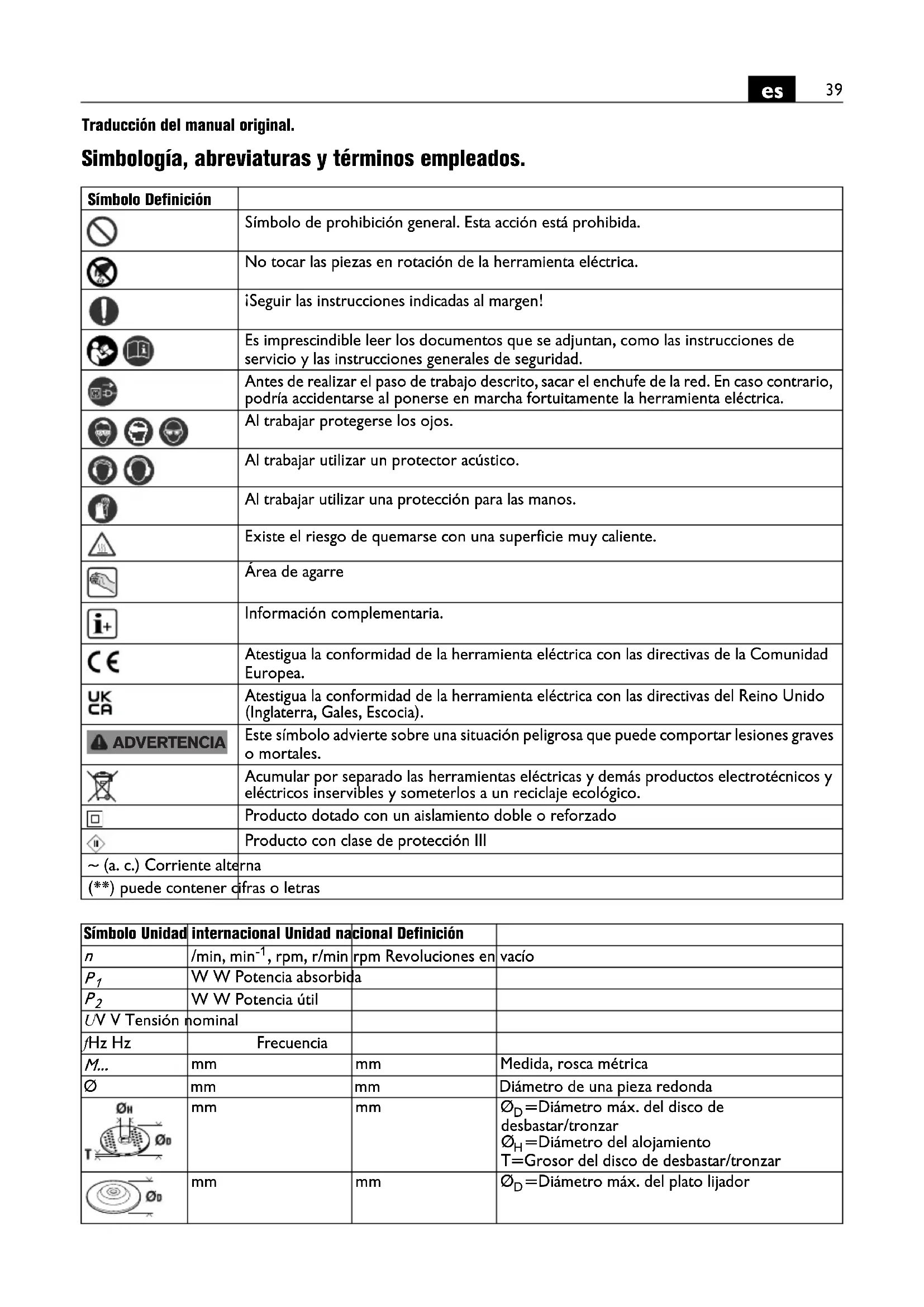Traducción del manual original. Simbología, abreviaturas y términos empleados. Símbolo Definición Símbolo de prohibición general. Esta acción está prohibida. No tocar las piezas en rotación de la herramienta eléctrica. ¡Seguir las instrucciones indicadas al margen! Es imprescindible leer los documentos que se adjuntan, como las instrucciones de servicio y las instrucciones generales de seguridad. Antes de realizar el paso de trabajo descrito, sacar el enchufe de la red. En caso contrario, podría accidentarse al ponerse en marcha fortuitamente la herramienta eléctrica. Al trabajar protegerse los ojos. Al trabajar utilizar un protector acústico. Al trabajar utilizar una protección para las manos. Existe el riesgo de quemarse con una superficie muy caliente. Área de agarre Información complementaria. Atestigua la conformidad de la herramienta eléctrica con las directivas de la Comunidad Europea. Atestigua la conformidad de la herramienta eléctrica con las directivas del Reino Unido (Inglaterra, Gales, Escocia). Este símbolo advierte sobre una situación peligrosa que puede comportar lesiones graves o mortales. Acumular por separado las herramientas eléctricas y demás productos electrotécnicos y eléctricos inservibles y someterlos a un reciclaje ecológico. Producto dotado con un aislamiento doble o reforzado Producto con clase de protección III ~ (a. c.) Corriente alterna (**) puede contener cifras o letras ADVERTENCIA Símbolo Unidad internacional Unidad nacional Definición