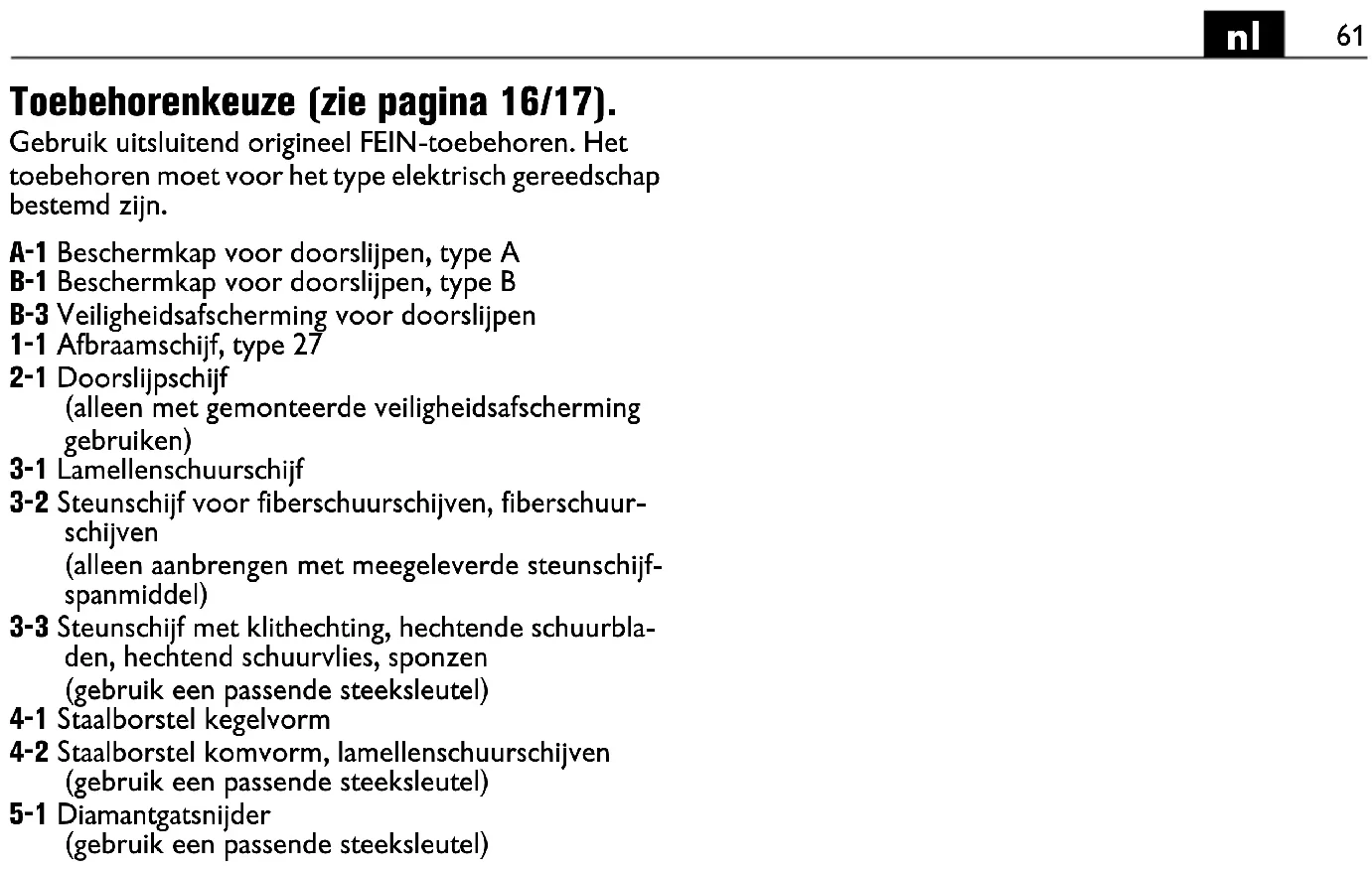 Accesorios disponibles (ver página 16/17). Únicamente utilice accesorios originales FEIN. Los acce- sorios deberán ser los apropiados para el tipo de herra- mienta eléctrica utilizado. A-1 Carcasa de protección para tronzar, tipo A B-1 Carcasa de protección para amolar, tipo B B-3 Cubierta de protección para trabajos de tronzado 1-1 Disco de desbastar, tipo 27 2-1 Disco de tronzar (solo emplear teniendo montada la cubierta de protección) 3-1 Disco lijador de láminas 3-2 Plato soporte para discos lijadores de fibra, discos lijadores de fibra (solo montarlos con los elementos de sujeción del plato de apoyo suministrados) 3-3 Plato lijador con cierre Velcro, hojas de lijar y vellón de lijar con cierre de cardillo, esponjas (use una llave fija adecuada) 4-1 Cepillo cónico de alambre de acero 4-2 Cepillo de vaso de alambre de acero, ruedas lijado- ras de láminas (use una llave fija adecuada) 5-1 Corona diamantada (use una llave fija adecuada)71