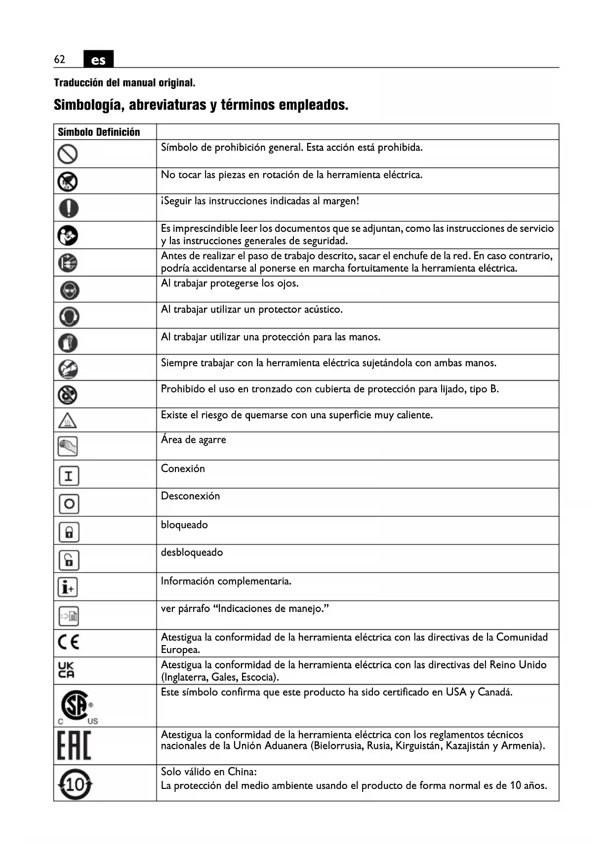 Traducción del manual original. Simbología, abreviaturas y términos empleados. Símbolo Definición Símbolo de prohibición general. Esta acción está prohibida. No tocar las piezas en rotación de la herramienta eléctrica. ¡Seguir las instrucciones indicadas al margen! Es imprescindible leer los documentos que se adjuntan, como las instrucciones de servicio y las instrucciones generales de seguridad. Antes de realizar el paso de trabajo descrito, sacar el enchufe de la red. En caso contrario, podría accidentarse al ponerse en marcha fortuitamente la herramienta eléctrica. Al trabajar protegerse los ojos. Al trabajar utilizar un protector acústico. Al trabajar utilizar una protección para las manos. Siempre trabajar con la herramienta eléctrica sujetándola con ambas manos. Prohibido el uso en tronzado con cubierta de protección para lijado, tipo B. Existe el riesgo de quemarse con una superficie muy caliente. Área de agarre Conexión Desconexión bloqueado desbloqueado Información complementaria. ver párrafo “Indicaciones de manejo.” Atestigua la conformidad de la herramienta eléctrica con las directivas de la Comunidad Europea. Atestigua la conformidad de la herramienta eléctrica con las directivas del Reino Unido (Inglaterra, Gales, Escocia). Este símbolo confirma que este producto ha sido certificado en USA y Canadá. Atestigua la conformidad de la herramienta eléctrica con los reglamentos técnicos nacionales de la Unión Aduanera (Bielorrusia, Rusia, Kirguistán, Kazajistán y Armenia). Solo válido en China: La protección del medio ambiente usando el producto de forma normal es de 10 años.63