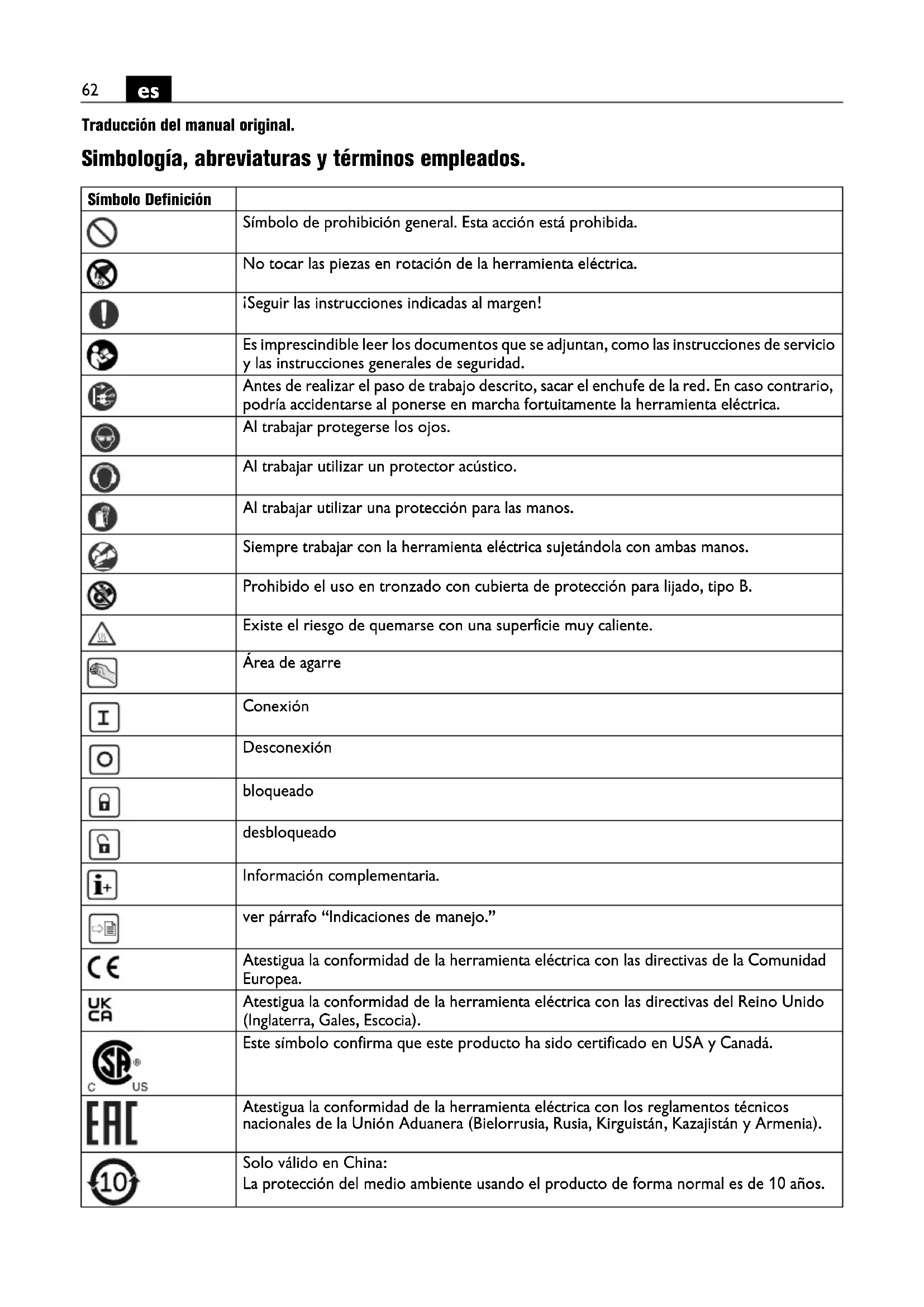 Traducción del manual original. Simbología, abreviaturas y términos empleados. Símbolo Definición Símbolo de prohibición general. Esta acción está prohibida. No tocar las piezas en rotación de la herramienta eléctrica. ¡Seguir las instrucciones indicadas al margen! Es imprescindible leer los documentos que se adjuntan, como las instrucciones de servicio y las instrucciones generales de seguridad. Antes de realizar el paso de trabajo descrito, sacar el enchufe de la red. En caso contrario, podría accidentarse al ponerse en marcha fortuitamente la herramienta eléctrica. Al trabajar protegerse los ojos. Al trabajar utilizar un protector acústico. Al trabajar utilizar una protección para las manos. Siempre trabajar con la herramienta eléctrica sujetándola con ambas manos. Prohibido el uso en tronzado con cubierta de protección para lijado, tipo B. Existe el riesgo de quemarse con una superficie muy caliente. Área de agarre Conexión Desconexión bloqueado desbloqueado Información complementaria. ver párrafo “Indicaciones de manejo.” Atestigua la conformidad de la herramienta eléctrica con las directivas de la Comunidad Europea. Atestigua la conformidad de la herramienta eléctrica con las directivas del Reino Unido (Inglaterra, Gales, Escocia). Este símbolo confirma que este producto ha sido certificado en USA y Canadá. Atestigua la conformidad de la herramienta eléctrica con los reglamentos técnicos nacionales de la Unión Aduanera (Bielorrusia, Rusia, Kirguistán, Kazajistán y Armenia). Solo válido en China: La protección del medio ambiente usando el producto de forma normal es de 10 años.63