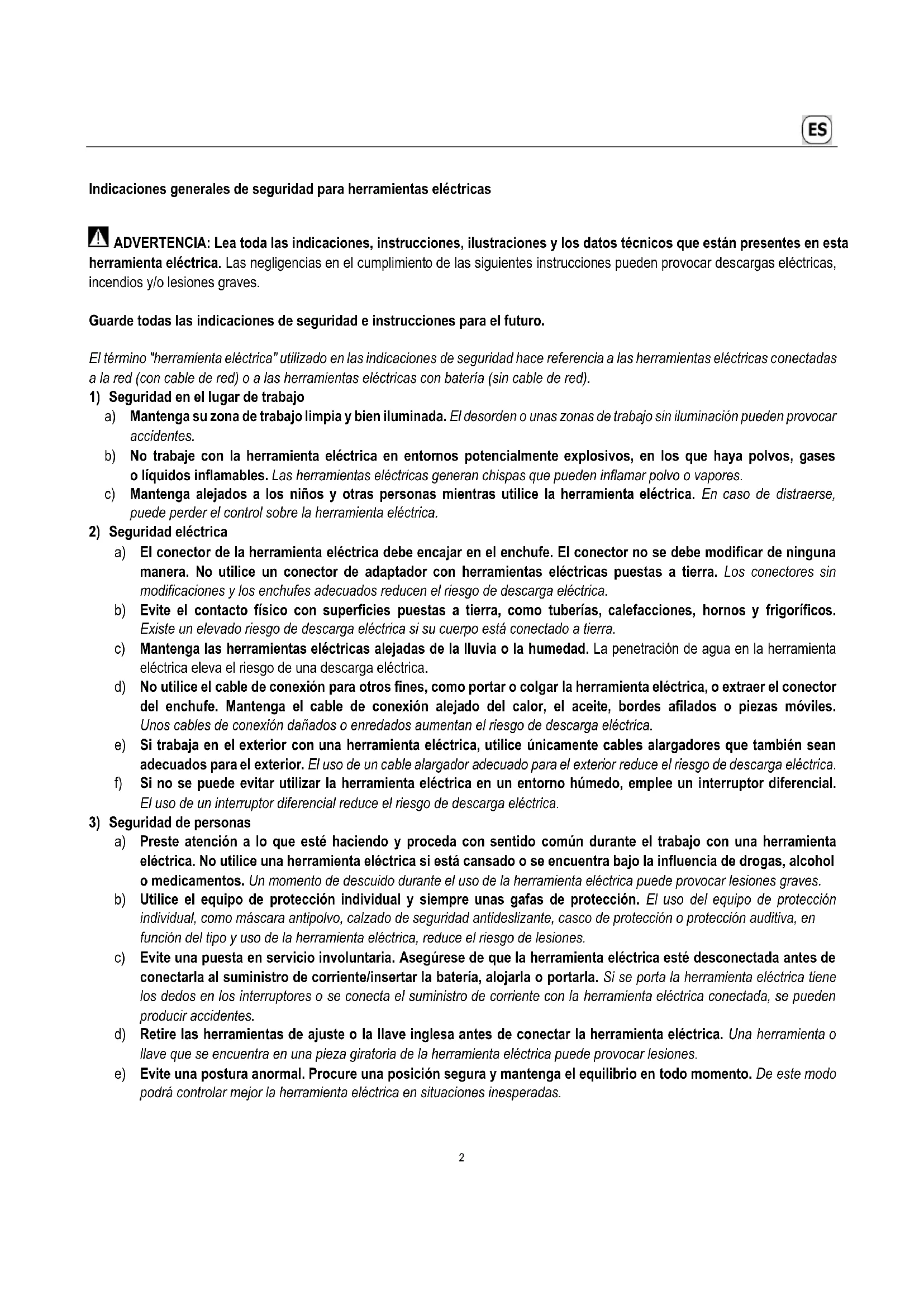 a) Mantenga su zona de trabajo limpia y bien iluminada. El desorden o unas zonas de trabajo sin iluminación pueden provocar accidentes. b) No trabaje con la herramienta eléctrica en entornos potencialmente explosivos, en los que haya polvos, gases o líquidos inflamables. Las herramientas eléctricas generan chispas que pueden inflamar polvo o vapores. c) Mantenga alejados a los niños y otras personas mientras utilice la herramienta eléctrica. En caso de distraerse, puede perder el control sobre la herramienta eléctrica.