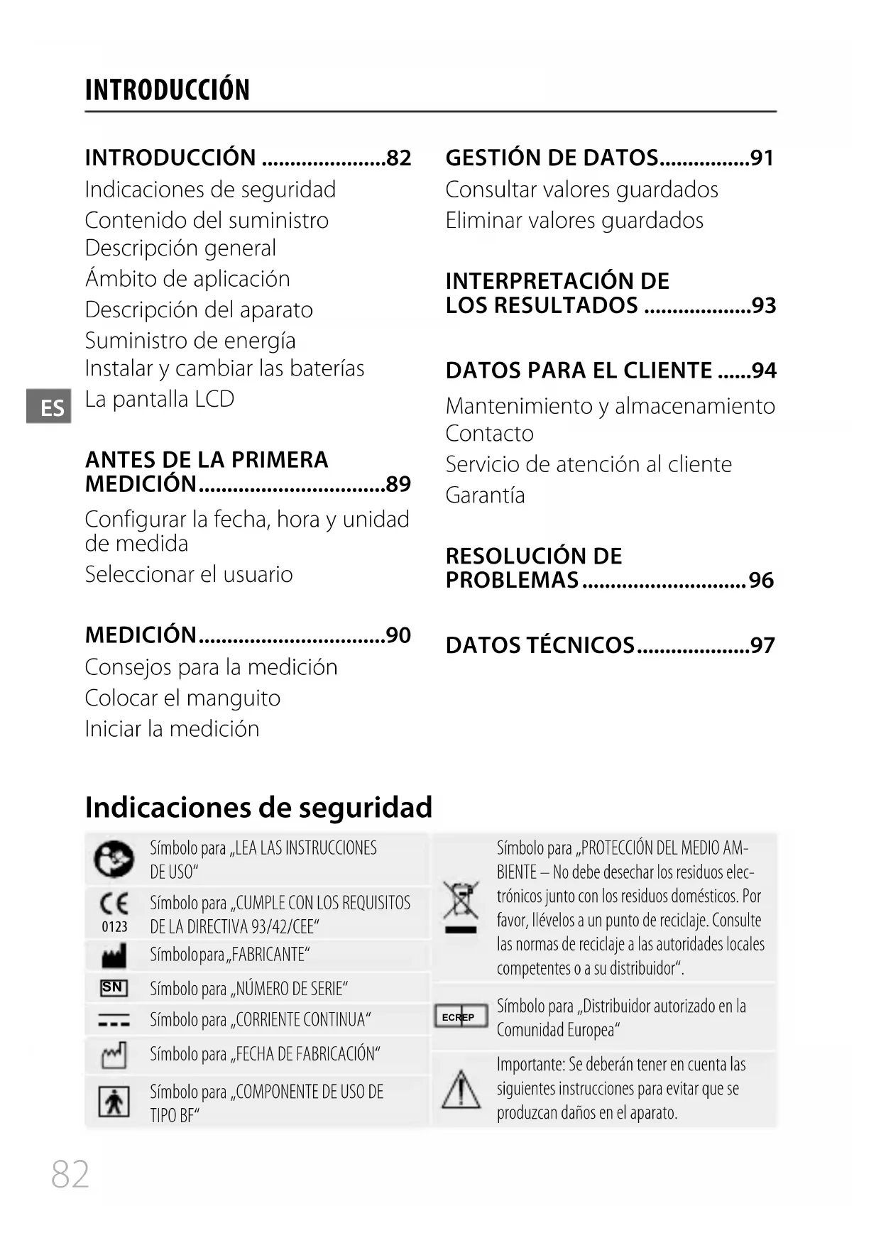 INTRODUCCIÓN INTRODUCCIÓN ......................82 Indicaciones de seguridad Contenido del suministro Descripción general Ámbito de aplicación Descripción del aparato Suministro de energía Instalar y cambiar las baterías La pantalla LCD