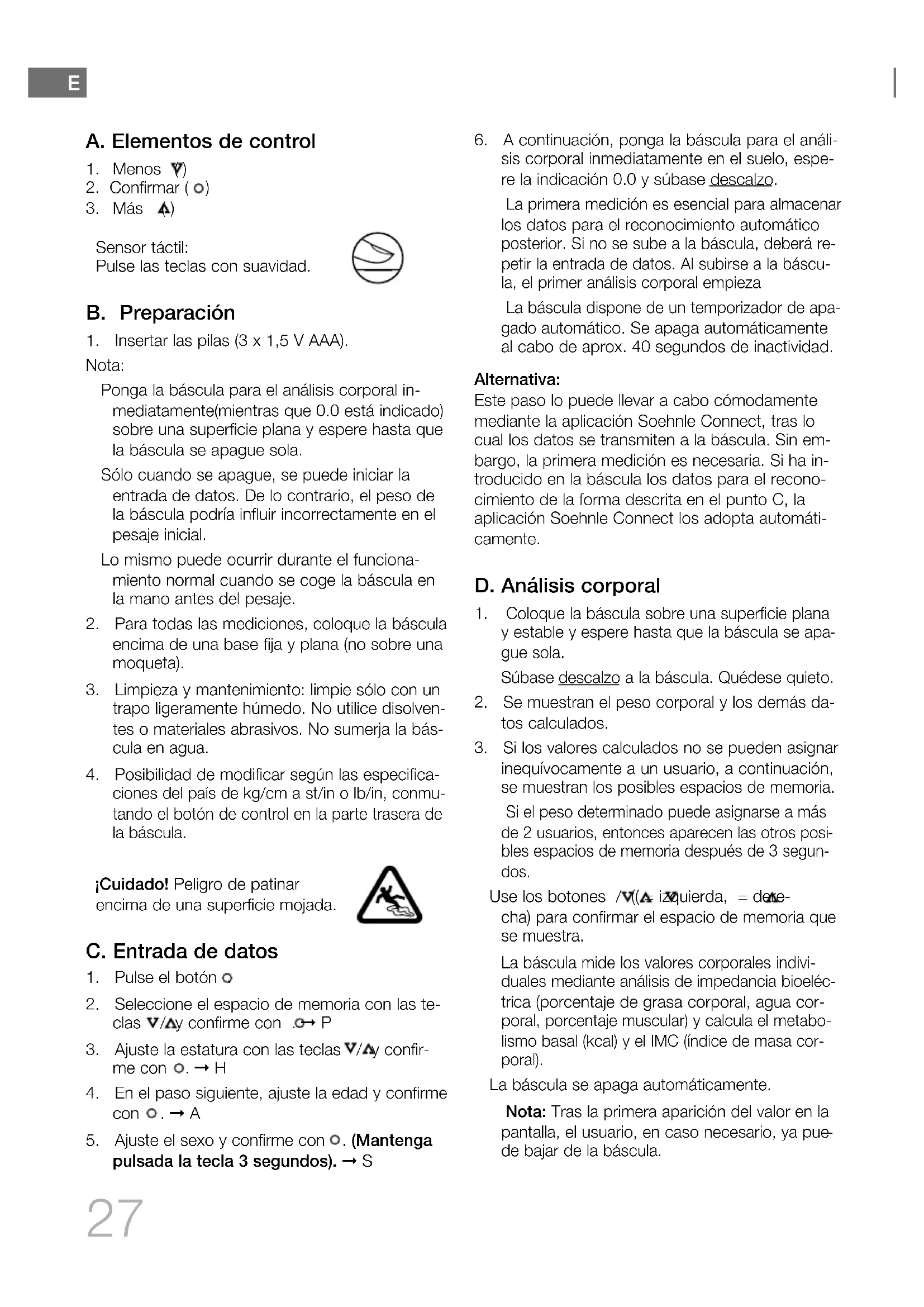 ciones del país de kg/cm a st/in o lb/in, conmu- tando el botón de control en la parte trasera de la báscula. ¡Cuidado! Peligro de patinar encima de una superficie mojada. C. Entrada de datos