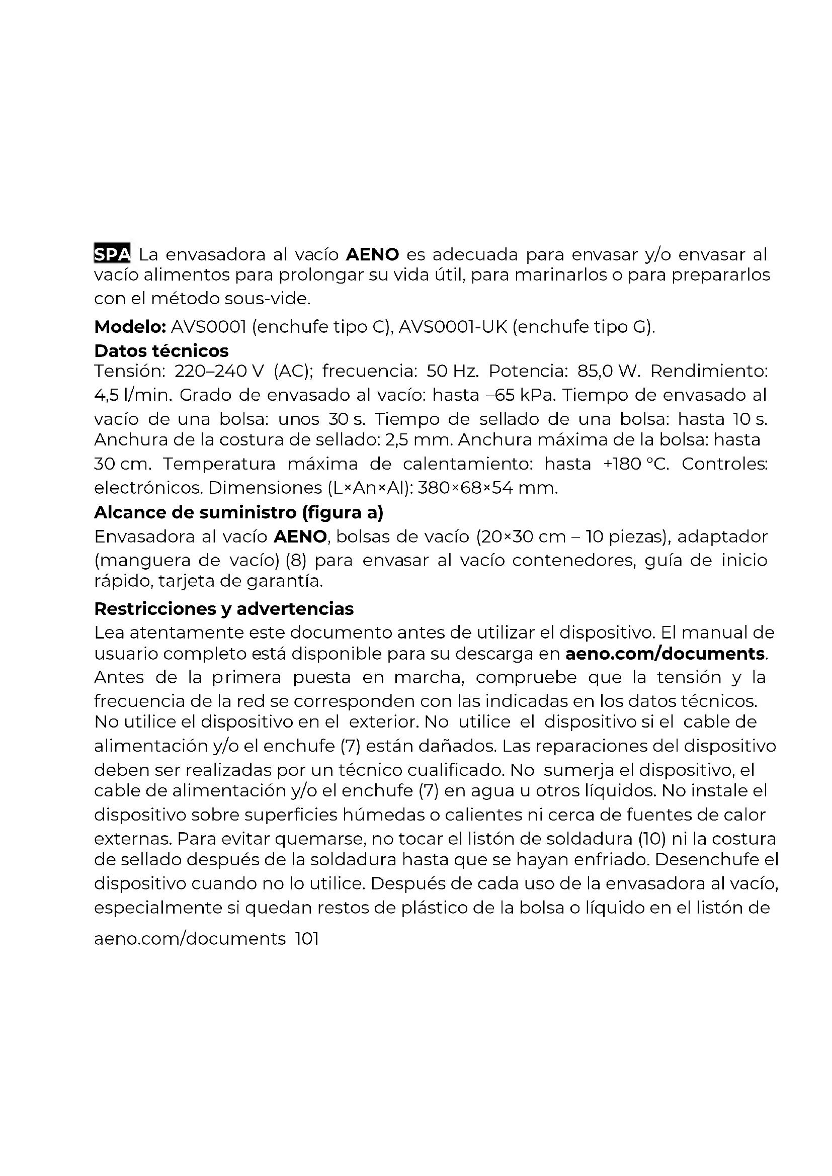 Spoločnosť ASBISc si vyhradzuje právo upravovať zariadenia a vykonávať zmeny a úpravy tohto dokumentu bez predchádzajúceho upozornenia používateľov. Záručná doba a životnosť je 2 roky od dátumu zakúpenia výrobku. Údaje o výrobcovi: ASBISc Enterprises PLC, Iapetou, 1, Agios Athanasios, 4101, Limassol, Cyprus (Cyprus). Vyrobené v Číne. Aktuálne informácie a podrobné popisy zariadení, ako aj návody na pripojenie, certifikáty, informácie o reklamáciách a zárukách sú k dispozícii na stiahnutie na stránke aeno.com/documents. Všetky uvedené ochranné známky a názvy značiek sú majetkom príslušných vlastníkov.aeno.com/documents 101 SPA La envasadora al vacío AENO es adecuada para envasar y/o envasar al vacío alimentos para prolongar su vida útil, para marinarlos o para prepararlos con el método sous-vide. Modelo: AVS0001 (enchufe tipo C), AVS0001-UK (enchufe tipo G). Datos técnicos Tensión: 220–240 V (AC); frecuencia: 50 Hz. Potencia: 85,0 W. Rendimiento: 4,5 l/min. Grado de envasado al vacío: hasta –65 kPa. Tiempo de envasado al vacío de una bolsa: unos 30 s. Tiempo de sellado de una bolsa: hasta 10 s. Anchura de la costura de sellado: 2,5 mm. Anchura máxima de la bolsa: hasta 30 cm. Temperatura máxima de calentamiento: hasta +180 °C. Controles: electrónicos. Dimensiones (L×An×Al): 380×68×54 mm. Alcance de suministro (figura a) Envasadora al vacío AENO, bolsas de vacío (20×30 cm – 10 piezas), adaptador (manguera de vacío) (8) para envasar al vacío contenedores, guía de inicio rápido, tarjeta de garantía. Restricciones y advertencias Lea atentamente este documento antes de utilizar el dispositivo. El manual de usuario completo está disponible para su descarga en aeno.com/documents. Antes de la primera puesta en marcha, compruebe que la tensión y la frecuencia de la red se corresponden con las indicadas en los datos técnicos. No utilice el dispositivo en el exterior. No utilice el dispositivo si el cable de alimentación y/o el enchufe (7) están dañados. Las reparaciones del dispositivo deben ser realizadas por un técnico cualificado. No sumerja el dispositivo, el cable de alimentación y/o el enchufe (7) en agua u otros líquidos. No instale el dispositivo sobre superficies húmedas o calientes ni cerca de fuentes de calor externas. Para evitar quemarse, no tocar el listón de soldadura (10) ni la costura de sellado después de la soldadura hasta que se hayan enfriado. Desenchufe el dispositivo cuando no lo utilice. Después de cada uso de la envasadora al vacío, especialmente si quedan restos de plástico de la bolsa o líquido en el listón de102 aeno.com/documents soldadura (10) o si han entrado migas o partículas de alimentos en la cámara de vacío (11), es necesario limpiarla. Desenchufe el dispositivo sacando el enchufe (7) de la toma de corriente y deje que se enfríe. Limpia su superficie con un paño suave empapado en agua tibia o en una solución jabonosa suave. A continuación, pase un paño suave humedecido con agua limpia y séquelo. No utilice detergentes fuertes, pastas abrasivas, abrillantadores o detergentes que contengan ácidos o disolventes. Utilice una envasadora al vacío para envasar al vacío y/o sellar sólo alimentos secos. El dispositivo no está diseñado para manipular alimentos húmedos o líquidos. Utilice únicamente bolsas y contenedores especiales para envasadores al vacío. El adaptador (manguera de vacío) (8) suministrado con la envasadora al vacío sólo se utiliza para bombear aire de los contenedores de vacío especiales. Antes de introducir en el horno microondas alimentos envasados en una bolsa o contenedor, haga un agujero en la bolsa o abra la válvula de salida (13) del contenedor para permitir la salida del vapor. Utilice únicamente los accesorios, consumibles y/o piezas de recambio recomendados por el fabricante. Encontrará información detallada en el manual completo, disponible para su descarga en aeno.com/documents. No deje el dispositivo encendido sin vigilancia. Deje que el dispositivo se enfríe después de usarlo. El dispositivo sólo puede ser utilizado por personas con movilidad reducida bajo supervisión y control directos. Cuando el aparato no está en uso, para evitar la deformación del sello (9) y el deterioro del funcionamiento del dispositivo, se aconseja colocar un papel dentro de la envasadora al vacío y cerrar la tapa sin bloquear los cierres de la tapa (12). No permita que los niños utilicen y/o jueguen con el dispositivo. Control del dispositivo Antes de encender la envasadora al vacío por primera vez, asegúrese de que todo el material de envasado ha sido retirado de la unidad. Sellado de bolsas