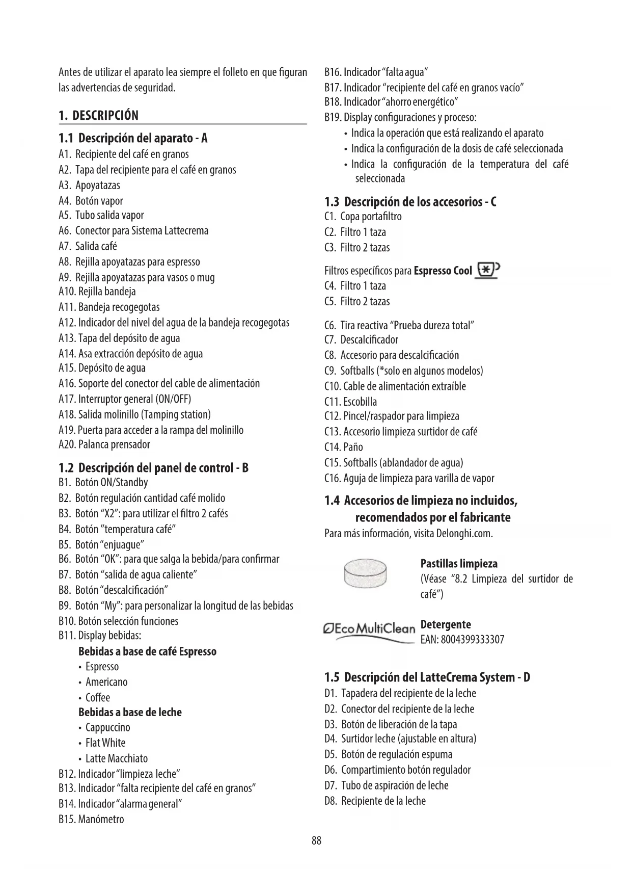 - Se recomienda usar solo descalcicador De’Longhi. El uso de descalcicadores no idóneos, como también la descal- cicación no realizada regularmente, puede comportar la aparición de defectos no cubiertos por la garantía.