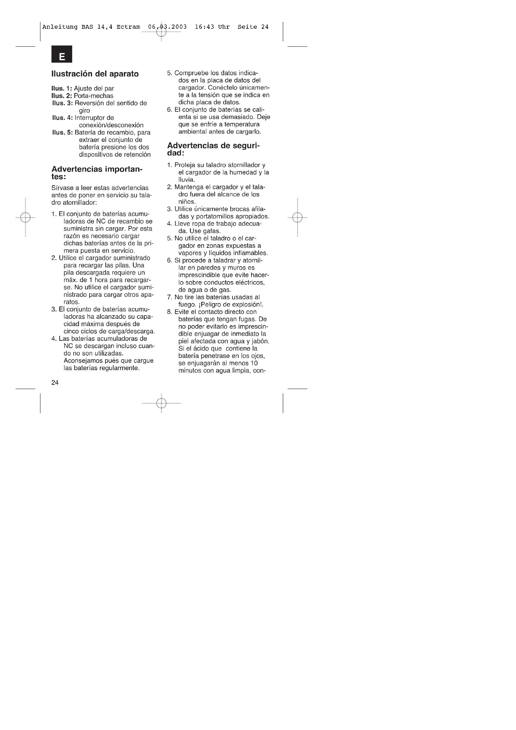 baterías que tengan fugas. De no poder evitarlo es imprescin- dible enjuagar de inmediato la piel afectada con agua y jabón. Si el ácido que contiene la batería penetrase en los ojos, se enjuagarán al menos 10 minutos con agua limpia, con- Anleitung BAS 14,4 Ectram 06.03.2003 16:43 Uhr Seite 2425