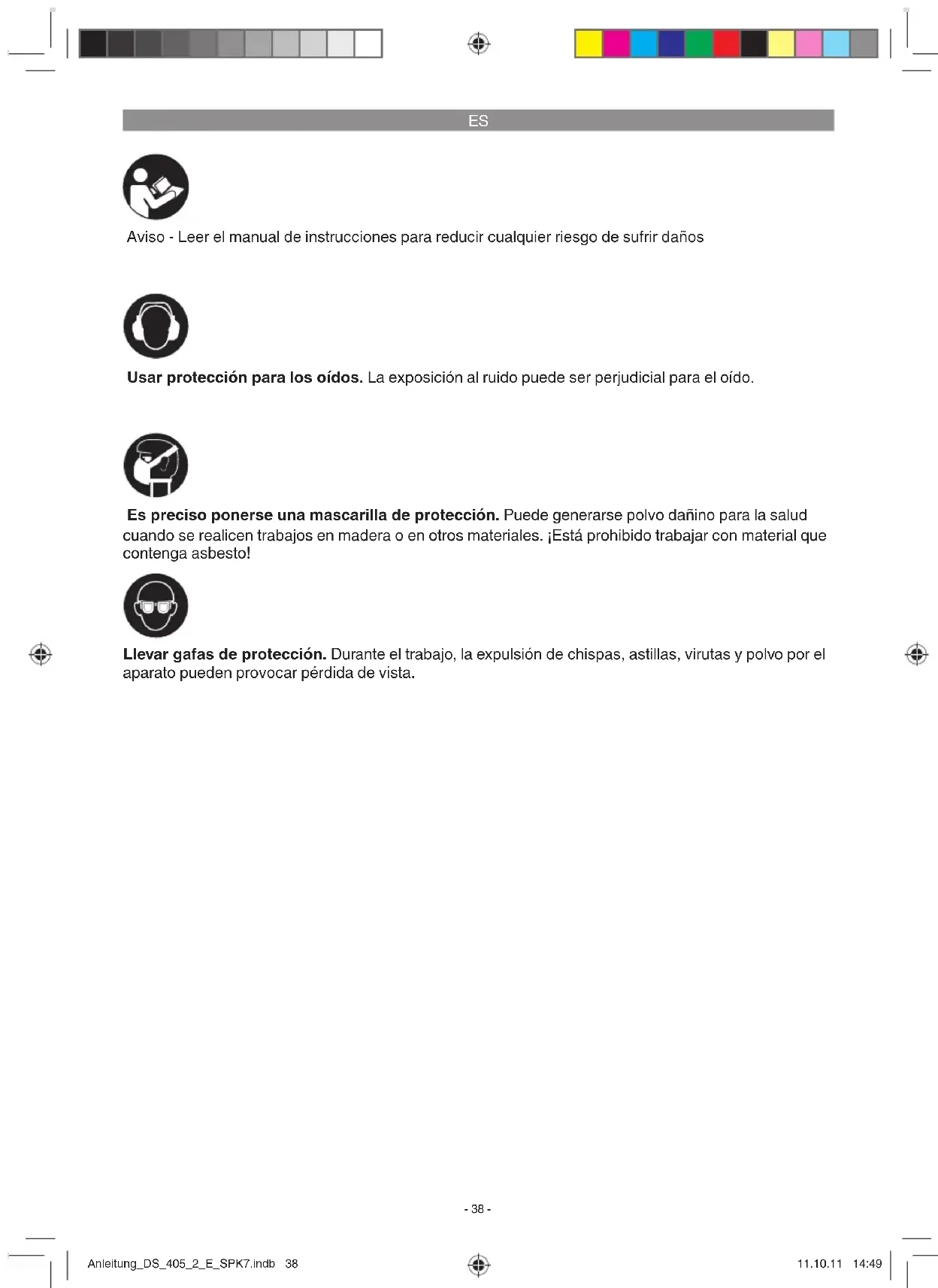 Aviso - Leer el manual de instrucciones para reducir cualquier riesgo de sufrir daños Usar protección para los oídos. La exposición al ruido puede ser perjudicial para el oído. Llevar gafas de protección. Durante el trabajo, la expulsión de chispas, astillas, virutas y polvo por el aparato pueden provocar pérdida de vista. Es preciso ponerse una mascarilla de protección. Puede generarse polvo dañino para la salud cuando se realicen trabajos en madera o en otros materiales. ¡Está prohibido trabajar con material que contenga asbesto! Anleitung_DS_405_2_E_SPK7.indb 38Anleitung_DS_405_2_E_SPK7.indb 38 11.10.11 14:4911.10.11 14:49ES
