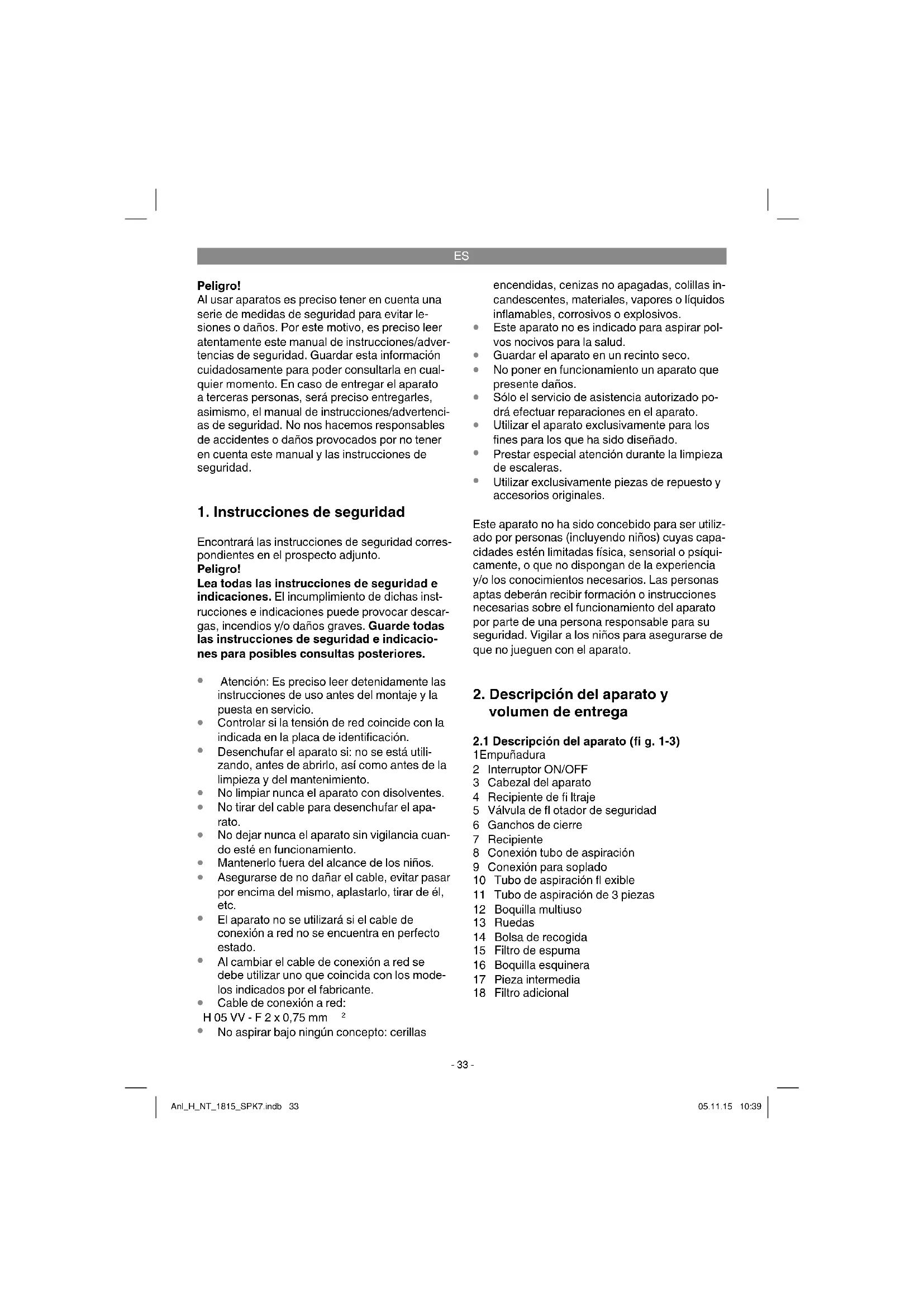 1 Empuñadura 2 Interruptor ON/OFF 3 Cabezal del aparato 4 Recipiente de fi ltraje 5 Válvula de fl otador de seguridad 6 Ganchos de cierre 7 Recipiente 8 Conexión tubo de aspiración 9 Conexión para soplado 10 Tubo de aspiración fl exible 11 Tubo de aspiración de 3 piezas 12 Boquilla multiuso 13 Ruedas 14 Bolsa de recogida 15 Filtro de espuma 16 Boquilla esquinera 17 Pieza intermedia 18 Filtro adicional Anl_H_NT_1815_SPK7.indb 33Anl_H_NT_1815_SPK7.indb 33 05.11.15 10:3905.11.15 10:39ES