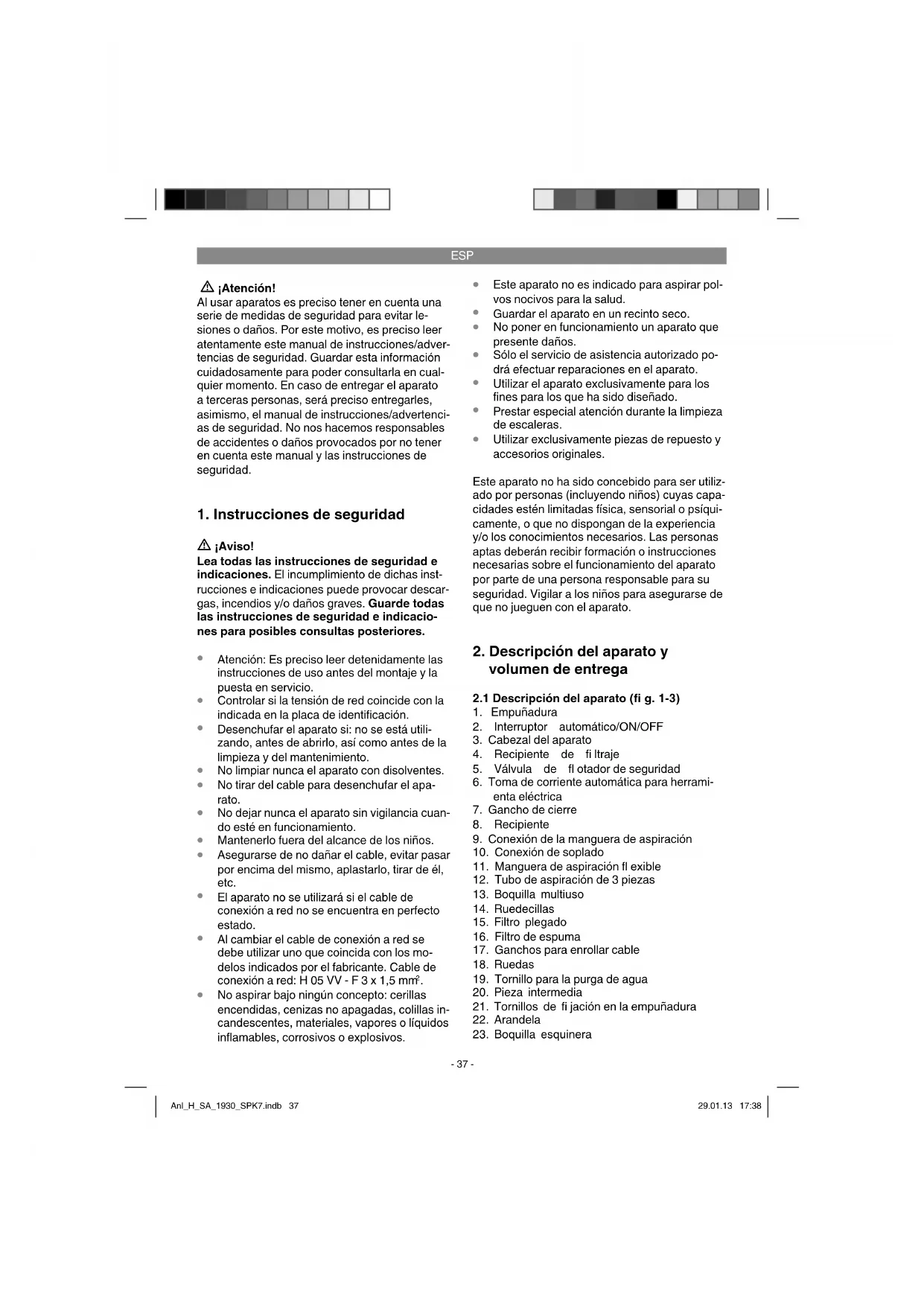 Para aspirar en húmedo utilizar el fi ltro de espu- ma (16) (véase punto 5.2). ¡Asegurarse de que el fi ltro esté siempre bien colocado! Tornillo para la purga de agua (fi g. 1) El recipiente (8) está provisto de un tornillo para la purga de agua (19) con el fi n de facilitar su vaciado en caso de aspirar en húmedo. Abrir el tornillo para la purga de agua (19) girándolo hacia la izquierda y dejar que salga el líquido. ¡Atención! En la aspiración en húmedo, la válvula de fl otador de seguridad (5) se cierra una vez alcanzado el nivel de llenado máximo en el recipiente. En tal caso, el ruido de aspiración del aparato aumenta. Apagar el aparato y vaciar el recipiente. ¡Atención! El aspirador en seco y húmedo no ha sido conce- bido para aspirar líquidos infl amables. ¡Para as- pirar en húmedo, utilizar sólo el fi ltro de espuma suministrado! Anl_H_SA_1930_SPK7.indb 39Anl_H_SA_1930_SPK7.indb 39 29.01.13 17:3829.01.13 17:38ESP