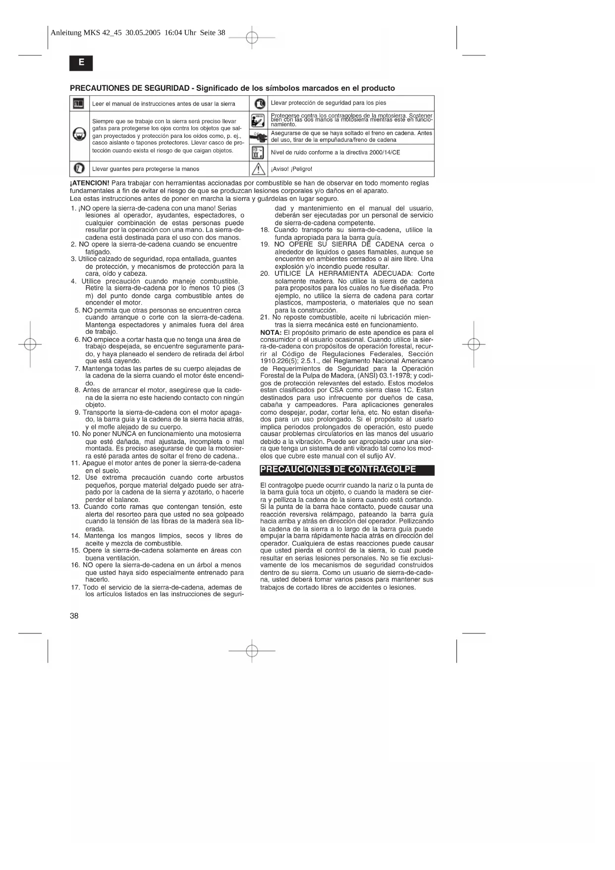 Leer el manual de instrucciones antes de usar la sierra Siempre que se trabaje con la sierra será preciso llevar gafas para protegerse los ojos contra los objetos que sal- gan proyectados y protección para los oídos como, p. ej., casco aislante o tapones protectores. Llevar casco de pro- tección cuando exista el riesgo de que caigan objetos. Protegerse contra los contragolpes de la motosierra. Sostener bien con las dos manos la motosierra mientras esté en funcio- namiento. Llevar guantes para protegerse la manos Llevar protección de seguridad para los pies Asegurarse de que se haya soltado el freno en cadena. Antes del uso, tirar de la empuñadura/freno de cadena Nivel de ruido conforme a la directiva 2000/14/CE ¡Aviso! ¡Peligro! Anleitung MKS 42_45 30.05.2005 16:04 Uhr Seite 3839