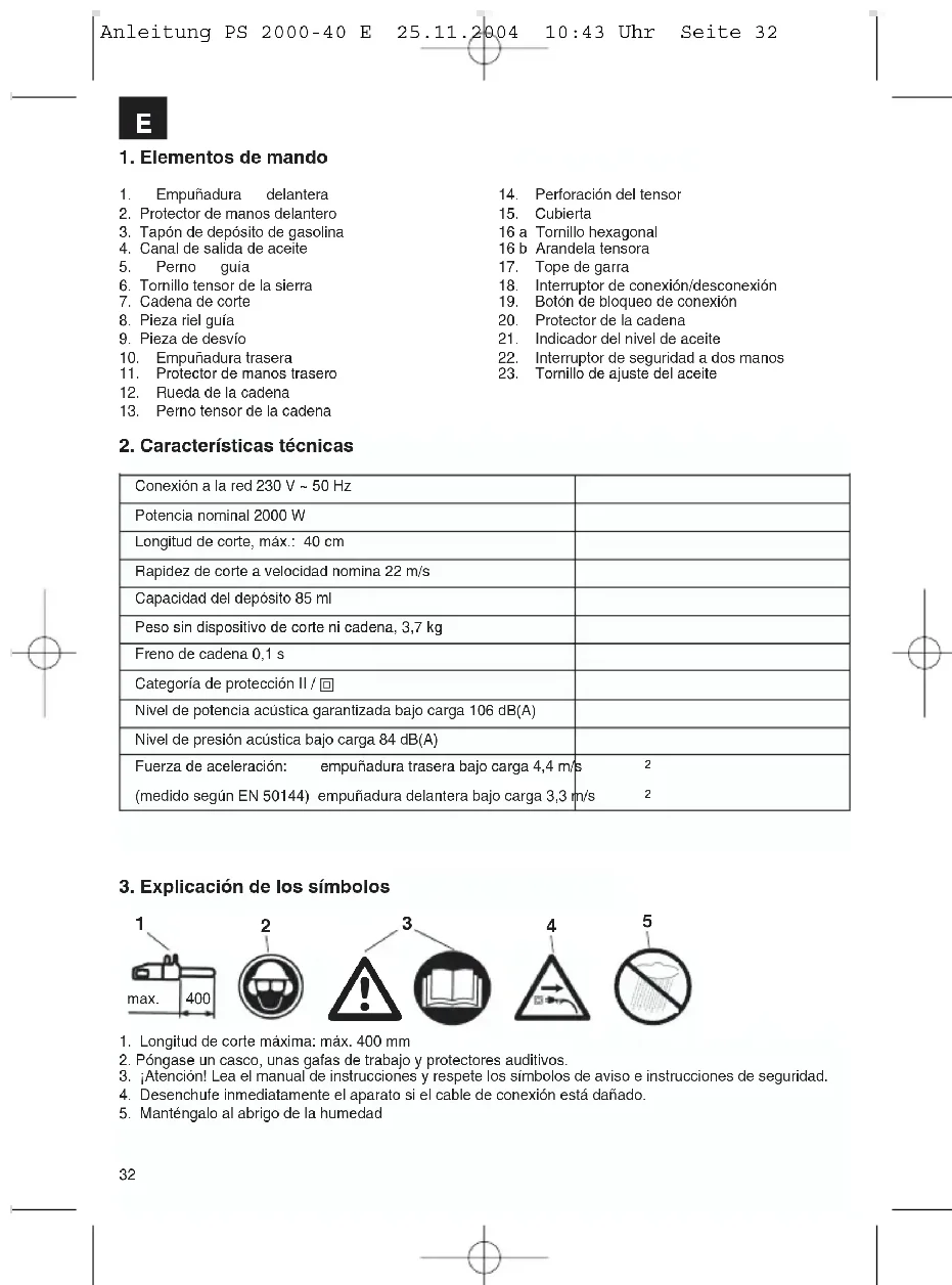 Anleitung PS 2000-40 E 25.11.2004 10:43 Uhr Seite 324. Instrucciones de seguridad Para trabajar con la máquina es imprescin- dible observar las instrucciones de perti- nentes. Para su seguridad y para la seguri- dad de terceros, observe estas instrucciones y las demás advertencias antes de trabajar con la motosierra. Guarde el manual en lugar seguro para uso posterior. Utilice la motosierra eléctrica únicamente para cortar madera (piezas de madera). Cualquier otro uso sucede bajo su propia responsabilidad y puede resultar peligroso. El fabricante no se hace res- ponsable de los daños causados por un uso inadecuado o manejo equivocado. Instrucciones de seguridad y pre- vención de accidentes Antes de la primera puesta en marcha es imprescindible leer atentamente el manual de instrucciones para evitar un manejo inadecuado de la motosierra. Todas las instrucciones de manejo de la sierra hacen siempre referencia a su seguridad perso- nal. ¡Consulte a un especialista para aprender a trabajar con la sierra! Antes de soltar el freno de la cadena, desconec- tar el aparato. Para evitar lesiones de oido, es imprescindible llevar protectores auditivos; se aconseja el uso de cascos con visera protectora para la cara. Trabajar siempre bien afianzado. Antes de colocar la máquina es necesario com- probar que esté desconectada. Retirar el enchufe de la toma de corriente antes de iniciar cualquier tipo de operación en la máquina. Únicamente se podrá enchufar la máquina a la toma de corriente cuando ésta se encuentre apagada. La motosierra sólo podrá ser operada por una persona. Está prohibida la permanencia de otras personas en el alcance de giro de la motosierra. Tenga especial cuidado con niños y animales de compañía. La sierra debe estar alejada de todo objeto antes de ponerse en marcha. ¡Sujetar con las dos manos la motosierra a la hora de realizar trabajos! Está prohibido el uso de la motosierra por parte de niños y adolescentes. Esta prohibición excluye a personas mayores de 16 años que se encuentren en perido de formación bajo vigilan- cia. Prestar la sierra únicamente a personas que estén familiarizadas con el manejo de este tipo de herramientas. Es imprescindible entregar asi- mismo el manual de instrucciones. Sólo podrán trabajar con la motosierra aquellas personas que se encuentren descansadas y sanas, es decir, en buen estado físico. Cuando se encuentre cansado, haga un descanso. No está permitido el uso de la motosierra tras haber consumido bebidas alcólicas. En caso de que no se vaya a utilizar la máquina durante un periodo de tiempo, guardarla de tal forma que nadie pueda correr peligro. Fijar el tope da garra antes de empezar a traba- jar con la sierra para realizar cualquier corte. Normalmente, el cable de conexión debe estar situado detrás del operario. Mantener el cable alejado de la parte trasera del aparato en todo momento. Utilizar únicamente accesorios originales. Los aparatos que se utilicen al aire libre deben estar conectados por medio de un interruptor de corriente de defecto. Alargaderas en el exterior: Si se trabaja al aire libre, utilizar sólo alar- gaderas homologadas a tal efecto y correspon- dientemente marcadas. Para serrar madera de corte y madera delgada de arbustos, adoptar una postura segura (cabal- lete para sierra, fig. 4). No apilar la madera al mismo tiempo que se corta y no permitir que otra persona la sujete con el pie. Fijar los maderos redondos debidamente. Si se trabaja en una pendiente colocarse siemp- re cara a la subida. Sacar la sierra de la madera únicamente con la sierra en marcha. Si se desean hacer varios cortes se debe parar la motosierra después de cada corte. Poner mucha atención al cortar madera astillada. Podrían salir despedidos pedazos de madera recién cortados (peligro de accidente). No utilizar la motosierra para apalancar y despla- zar las piezas de madera cortadas u otros objet- os. Los trabajos de desramado sólo deben ser efec- tuados por personas debidamente adiestradas. ¡Peligro de accidente! Es preciso poner atención si hay ramas que se hallen bajo tensión. Las ramas que se hallen col- gando libremente no deberán cortarse por deba- jo. No se deberá desramar un árbol poniéndose de pie sobre el tronco del mismo. La motosierra no deberá utilizarse para trabajos forestales, es decir para talar árboles o cortar