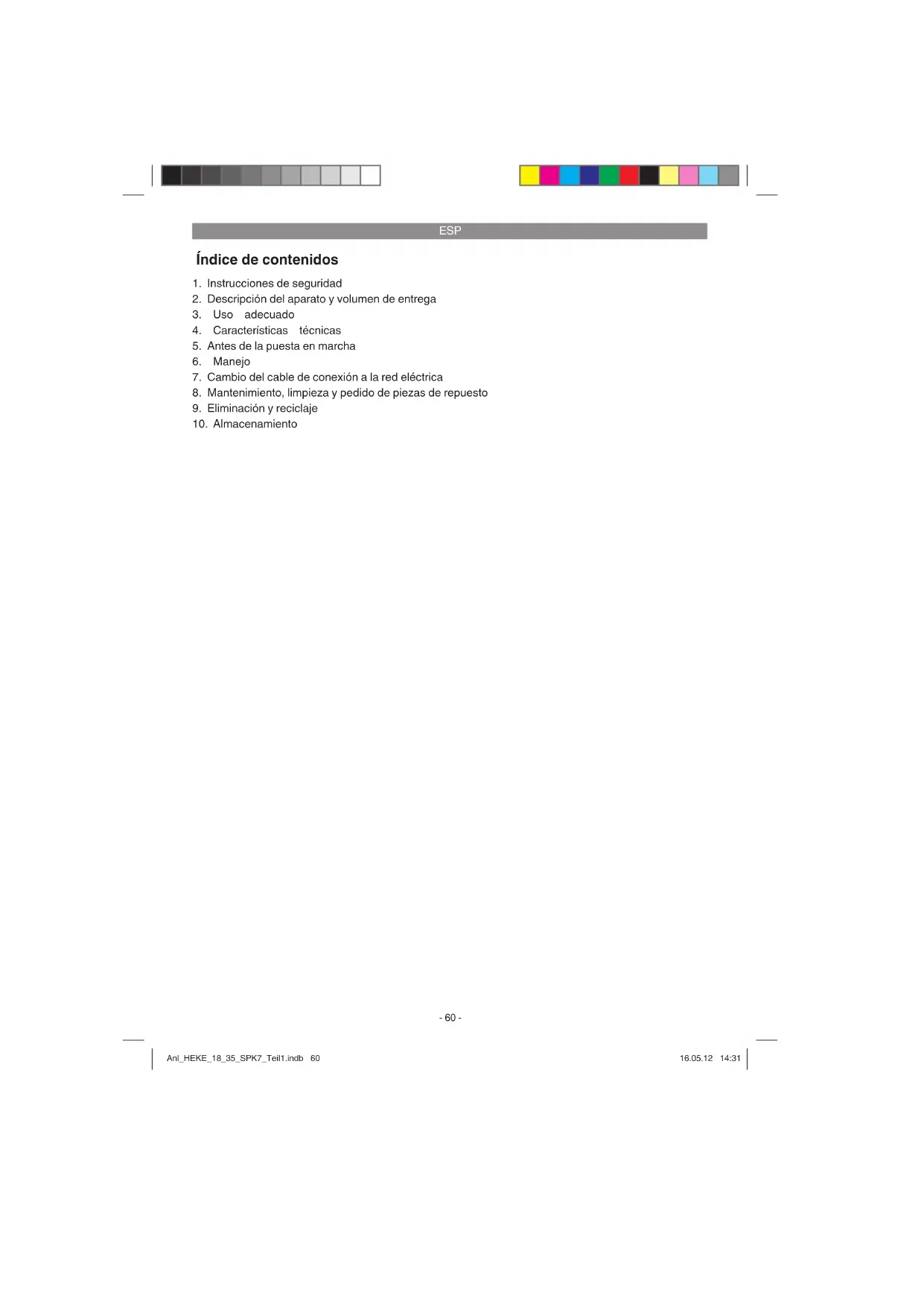 indicada a continuación. Adjunte el original del ticket de compra u otro tipo de comprobante de compra con fecha. ¡A tal efecto, guarde en lugar seguro el ticket de compra como comprobante! Describa con la mayor precisión posible el motivo de la reclamación. Si nuestra prestación de ga- rantía incluye el defecto aparecido en el aparato, recibirá de inmediato un aparato reparado o nuevo de vuelta. Para piezas de desgaste, de repuesto y falta de piezas nos remitimos a las limitaciones de esta garantía conforme a las condiciones de garantía de este manual de instrucciones. Anl_HEKE_18_35_SPK7_Teil1.indb 72Anl_HEKE_18_35_SPK7_Teil1.indb 72 16.05.12 14:3116.05.12 14:31DNK