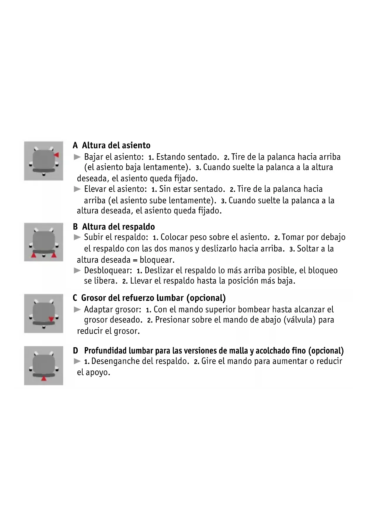 Profundidad lumbar para las versiones de malla y acolchado fino (opcional) ® 1. Desenganche del respaldo. 2. Gire el mando para aumentar o reducir el apoyo. C Grosor del refuerzo lumbar (opcional) ® Adaptar grosor: 1. Con el mando superior bombear hasta alcanzar el grosor deseado. 2. Presionar sobre el mando de abajo (válvula) para reducir el grosor.11 F Fuerza de la tensión del respaldo ® 1. Ajuste dinámico del respaldo. 2. Reduzca ligeramente la presión sobre el asiento y el respaldo. 3. Gire hacia abajo el ajuste rápido (mayor tensión del respaldo) o hacia arriba (menor tensión del respaldo) hasta alcanzar la posición deseada. G Profundidad del asiento (opcional) ® 1. Pulse y mantenga presionada la palanca. 2. Deslice el cojín del asiento a la posición deseada. 3. Cuando suelte la palanca, el asiento queda fijado. H Inclinación de la superficie de asiento (opcional) ® 1. Sin sentarse. 2. Gire la palanca hacia atrás (el asiento se inclina 4º hacia delante) o hacia abajo (el asiento vuelve a su posición inicial). E Inclinación del respaldo ® Ajuste dinámico del respaldo: 1. Tire de la palanca hacia arriba, suéltela. 2. Apoye la espalda. 3. El bloqueo se libera automáticamente. ® Bloquear el respaldo: 1. Apóyese hasta alcanzar la inclinación deseada del respaldo. 2. Pulse la palanca hacia abajo, suéltela; el respaldo queda fijado.I Regulación de los reposabrazos básicos (opcional) ® Altura: 1. Presione el botón; mueva el reposabrazos hacia arriba o hacia abajo. 2. Suelte el botón y quedará fijado. ®Anchura de asiento útil: 1. Afloje ligeramente los tornillos Torx (TX40).