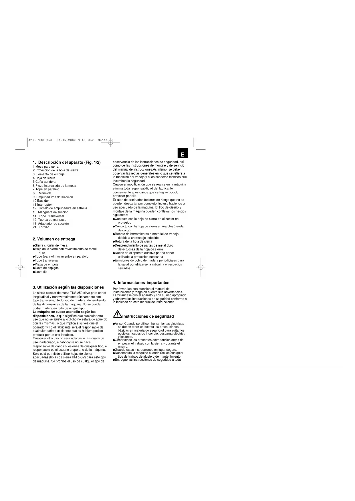 Por favor, lea con atención el manual de instrucciones y tenga en cuenta sus advertencias. Familiarícese con el aparato y con su uso apropiado y observe las instrucciones de seguridad conforme a lo indicado en este manual de instrucciones. Instrucciones de seguridad Aviso: Cuando se utilicen herramientas eléctricas se deben tener en cuenta las precauciones básicas en materia de seguridad para evitar los posibles riesgos de incendio, descarga eléctrica y lesiones. Obsérvense las presentes advertencias antes de empezar el trabajo con la sierra y durante el mismo. Guarde estas instrucciones en lugar seguro. Desenchufe la máquina cuando realice cualquier tipo de trabajo de ajuste o de mantenimiento Entregue las instrucciones de seguridad a toda Anl. TKS 250 03.05.2002 9:47 Uhr Seite 35E Absténgase de cortar transversalmente la madera en rollo No olvide que la hoja de sierra en marcha representa un peligro importante para manos y dedos La máquina está equipada con un interruptor de seguridad (11) contra rearranque después de una caída de tensión. Por favor, compruebe antes de la puesta en marcha si la tensión indicada en la placa de características del aparato coincide con la tensión de alimentación Si es necesaria una alargadera, asegúrese de que su sección transversal sea suficiente para la absorción de corriente de la sierra. La sección transversal mínima es de 1 mm