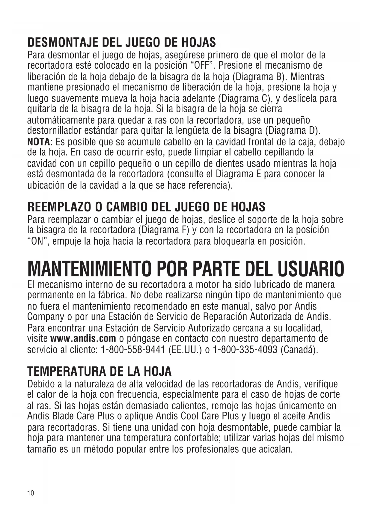 El mecanismo interno de su recortadora a motor ha sido lubricado de manera permanente en la fábrica. No debe realizarse ningún tipo de mantenimiento que no fuera el mantenimiento recomendado en este manual, salvo por Andis Company o por una Estación de Servicio de Reparación Autorizada de Andis. Para encontrar una Estación de Servicio Autorizado cercana a su localidad, visite www.andis.com o póngase en contacto con nuestro departamento de servicio al cliente: 1-800-558-9441 (EE.UU.) o 1-800-335-4093 (Canadá).