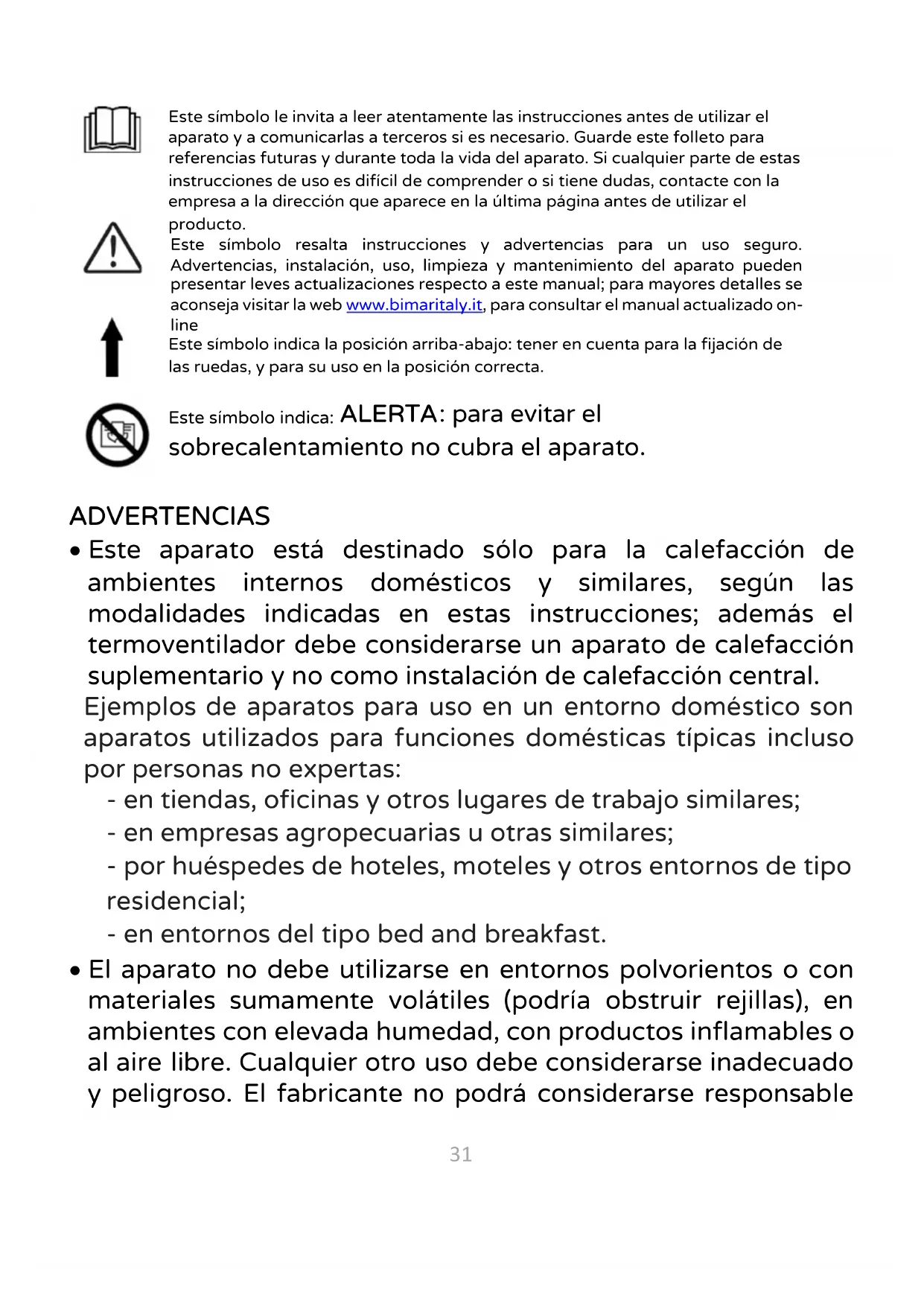 Este símbolo le invita a leer atentamente las instrucciones antes de utilizar el aparato y a comunicarlas a terceros si es necesario. Guarde este folleto para referencias futuras y durante toda la vida del aparato. Si cualquier parte de estas instrucciones de uso es difícil de comprender o si tiene dudas, contacte con la empresa a la dirección que aparece en la última página antes de utilizar el producto. Este símbolo resalta instrucciones y advertencias para un uso seguro. Advertencias, instalación, uso, limpieza y mantenimiento del aparato pueden presentar leves actualizaciones respecto a este manual; para mayores detalles se aconseja visitar la web www.bimaritaly.it, para consultar el manual actualizado on-line Este símbolo indica la posición arriba-abajo: tener en cuenta para la fijación de las ruedas, y para su uso en la posición correcta. Este símbolo indica: ALERTA : para evitar el sobrecalentamiento no cubra el aparato.32 por ninguno de los posibles daños provocados por el uso inadecuado, incorrecto o irresponsable y/o por reparaciones realizadas por personal no calificado.