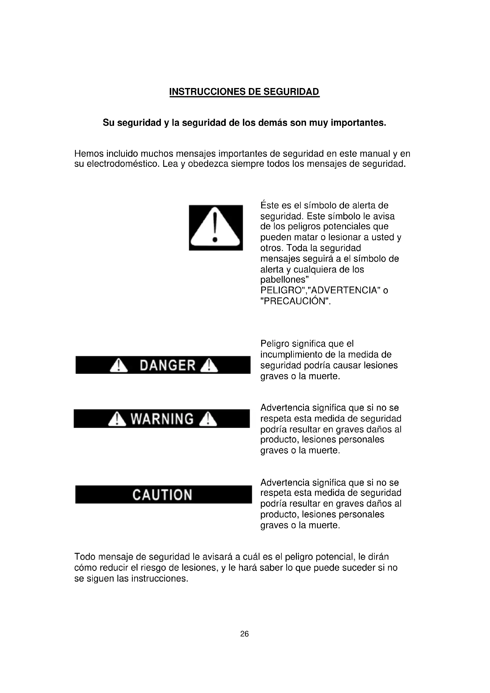 Todo mensaje de seguridad le avisará a cuál es el peligro potencial, le dirán cómo reducir el riesgo de lesiones, y le hará saber lo que puede suceder si no se siguen las instrucciones.27