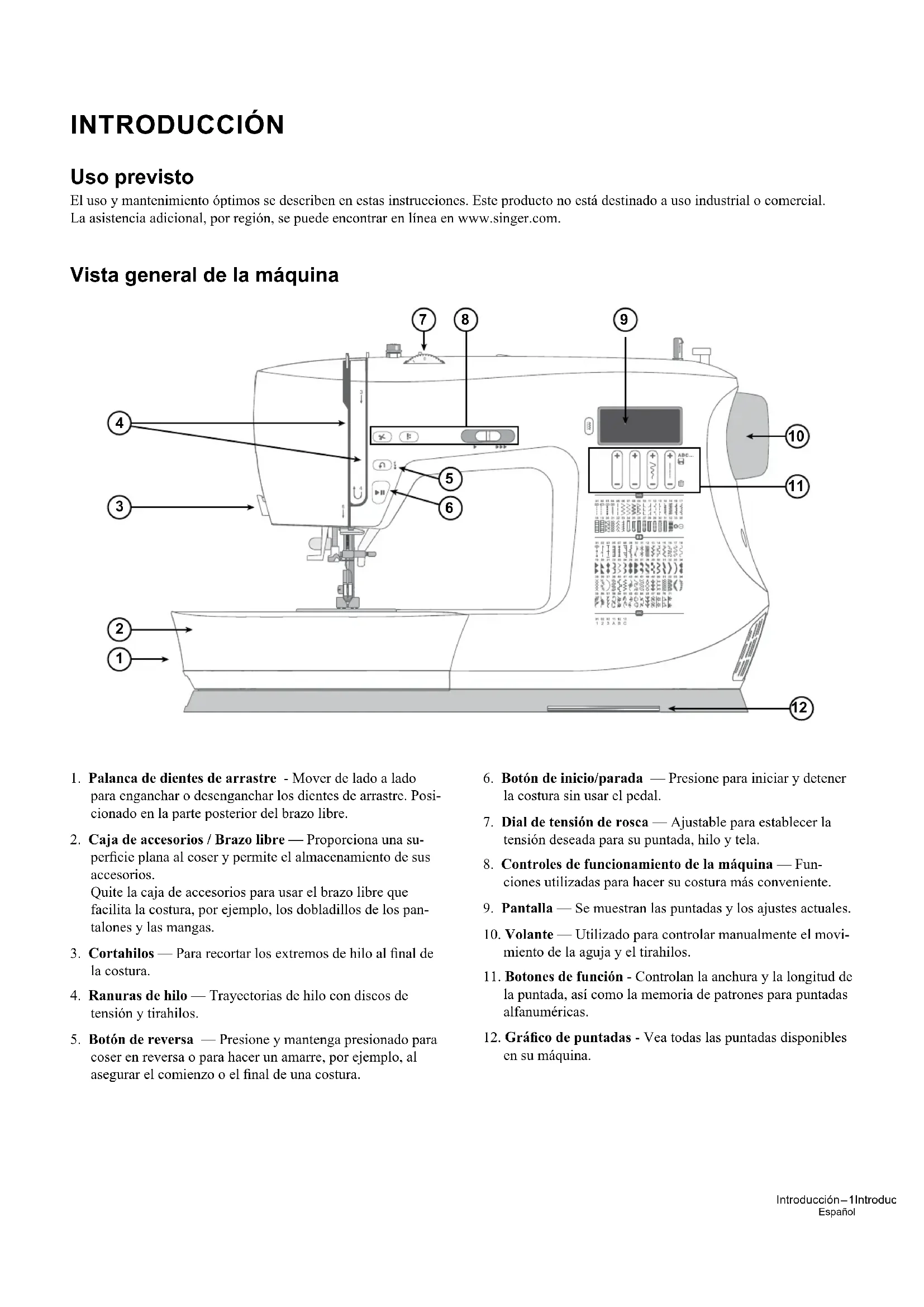 - Tabla de extensión (sólo disponible para C7220 / C7225 / C7250 / C7255) Bobina x4 — Sólo utilice el tipo de bobinas transparentes suministradas con su máquina (bobinas transparentes Clase 15 SINGER®). Una de las bobinas está insertada en la máquina en el momento de la entrega. Disco de eltro — Utilizado para amortiguar el carrete del hilo al usar el portacarretes auxiliar. Disco sujeta-bobinas — Dos tamaños (grande y pequeño) para diversos estilos de carrete de hilo. Portacarretes auxiliar— Para coser con carretes de hilo grandes o al usar hilos especiales. Brocha y descosedor — Utilizado para retirar las puntadas/eliminar pelusa. Destornillador en L — Utilizado para retirar la placa de agujas, el soporte del prensatelas o el tornillo de la aguja. Guía para bordes/acolchados — Se utiliza para la costura recta y precisa, por ejemplo, cuando se acol- cha. Inserte la guía en la ranura de la parte posterior del soporte del prensatelas. Ajuste la posición para que se adapte a su proyecto.4 – Introducción Español 4 – Introducción Prensatelas Prensatelas universal (T) (adjunto a la máquina en el momento de la entrega) Este prensatelas se utiliza para costura general en la mayoría de los tipos de tela. La parte inferior del prensatelas es plana, de tal forma que la tela se sujeta con rmeza a los dientes de arrastre mientras cose. También tiene una ranura ancha que permite a la aguja moverse de izquierda a derecha, en función de la puntada que dé.