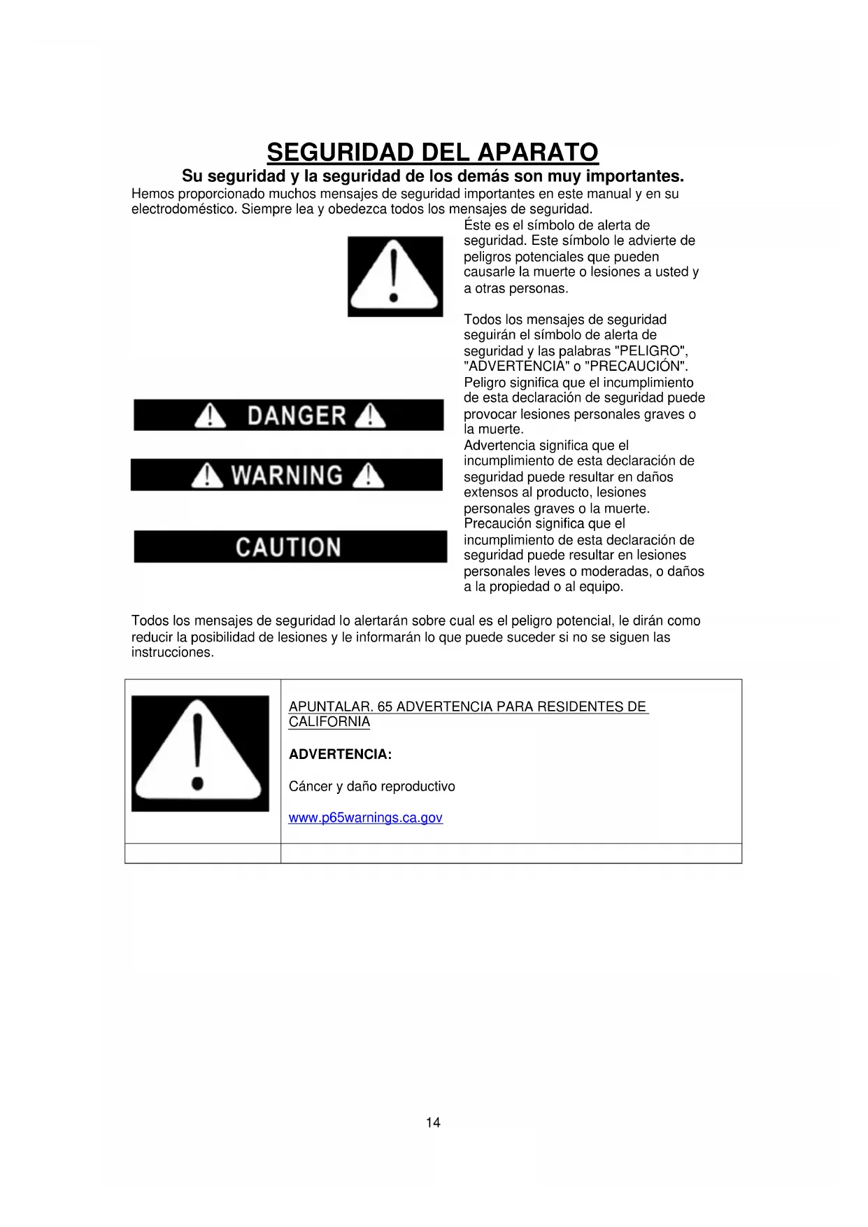 Éste es el símbolo de alerta de seguridad. Este símbolo le advierte de peligros potenciales que pueden causarle la muerte o lesiones a usted y a otras personas. Todos los mensajes de seguridad seguirán el símbolo de alerta de seguridad y las palabras "PELIGRO", "ADVERTENCIA" o "PRECAUCIÓN".
