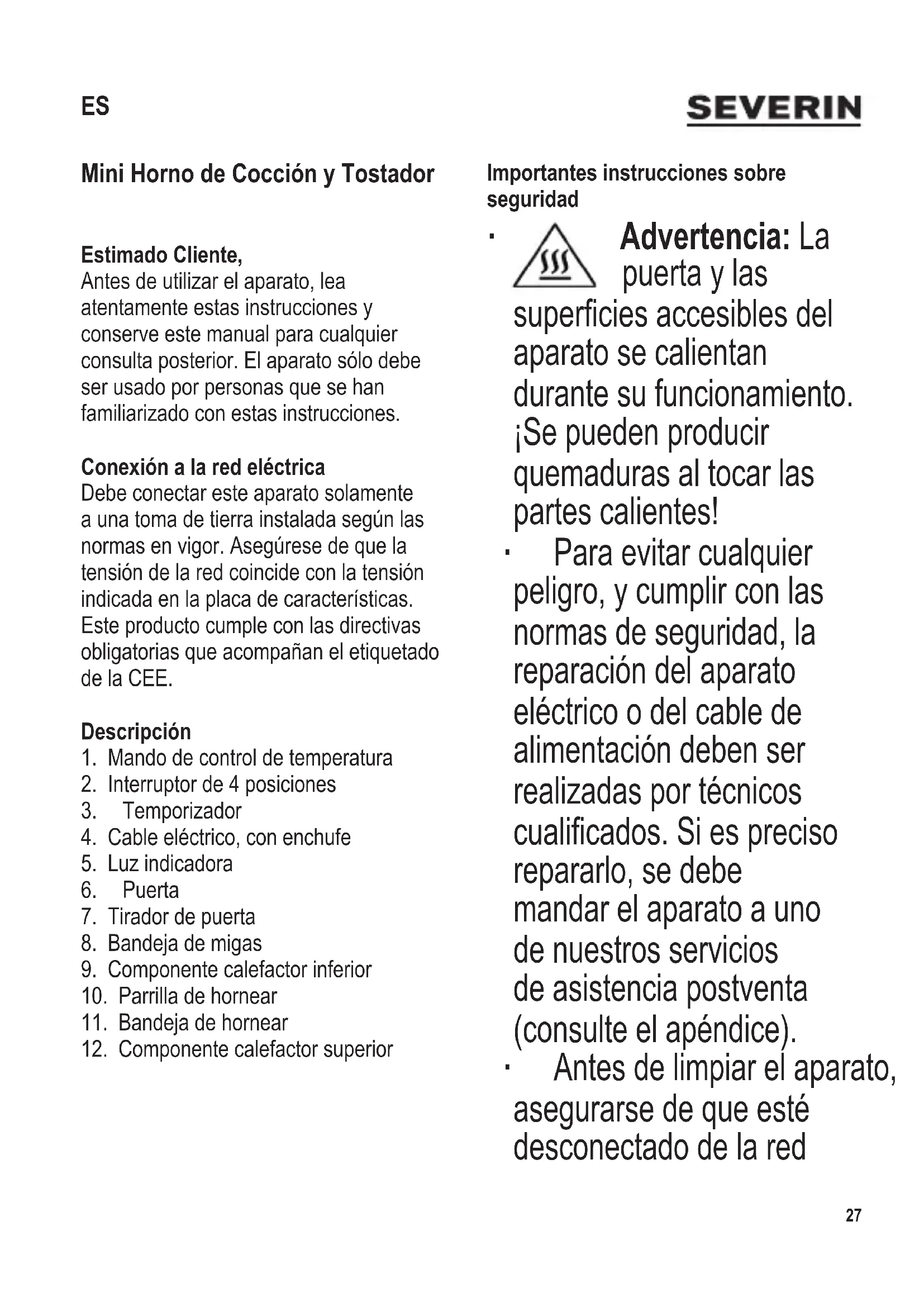 vigilancia y tengan más de 8 años. ∙ El aparato y su cable eléctrico siempre se deben mantener fuera del alcance de niños menores de 8 años. ∙ Precaución: Mantenga a los niños alejados del material de embalaje, porque podría ser peligroso, existe el peligro de asxia. ∙ Antes de utilizar el aparato, siempre se debe comprobar que tanto la unidad principal, el cable de alimentación como cualquier accesorio no están defectuosos. En caso de que el aparato haya caído sobre una supercie dura, o se haya tirado en exceso del cable de alimentación, no se deberá utilizar de nuevo: incluso los desperfectos no visibles pueden tener efectos adversos sobre la seguridad en el uso del aparato. ∙ No toque los elementos calefactores. ∙ Antes de utilizar este aparato, debe instalarse la bandeja de migas en la posición correcta debajo del elemento calefactor inferior. ∙ El aceite o la grasa calentados en exceso pueden incendiarse. Por lo tanto no llene en exceso la bandeja de hornear; de este modo evitará que la grasa gotee y caiga sobre el elemento calefactor inferior. ∙ Durante su utilización, la bandeja de hornear siempre se debe colocar en la parrilla de hornear. ∙ No permita que ningún objeto alado o abrasivo esté en contacto con la bandeja de hornear durante su utilización o limpieza. ∙ No deje el aparato sin vigilancia durante su funcionamiento. ∙ No utilizar el aparato en el exterior. ∙ Debe asegurar una ventilación suciente en todo momento. No coloque objetos encima de la unidad, y asegúrese de que se respeten las siguientes distancias mínimas de una pared u otro objeto: Lado: 12 cm Posterior: 12 cm Superior: 30 cm ∙ No debe instalarse este aparato dentro de un armario; al colocar el aparato, asegúrese también de no situarlo inmediatamente debajo de un armario o de cualquier otro objeto similar. ∙ No debe quitarle los pies que se encuentran en la base de la unidad. ∙ No utilice ni coloque este aparato cerca de objetos tales como cortinas o materiales inamables. ∙ Cuando el aparato esté funcionando debe colocarse sobre una supercie resistente al calor. No coloque el aparato sobre o cerca de supercies calientes tales como resistencias eléctricas, ni próximo a una salida de gas u otras fuentes de calor. ∙ No deje que el cable de alimentación entre en contacto con ninguna parte del aparato que esté caliente. ∙ No permita que el cable de conexión cuelgue libremente.30 104 x 142 mm ∙ Desenchufe siempre el aparato - después del uso, - si hay una avería, y - antes de limpiarlo. ∙ Para desenchufar, no tire nunca del cable; agarre la clavija. ∙ No se acepta la responsabilidad si hay averías a consecuencia del uso incorrecto del aparato o si estas instrucciones no han sido observadas debidamente. Mando de control de temperatura El mando de control de la temperatura se utiliza para seleccionar el nivel de temperatura deseado. Las 4 posiciones del interruptor Los dos calentadores están apagados Calentador superior Calentador inferior Calentador superior e inferior Los dos calentadores se encenderán solo cuando se active el temporizador. Temporizador ∙ Con ayuda del temporizador podemos seleccionar el tiempo de elaboración de los alimentos (máximo 60 minutos). ∙ Si desea programar un tiempo de funcionamiento, gire el botón del temporizador en el sentido de las agujas del reloj hasta el valor deseado. ∙ Si desea seleccionar una duración inferior a 10 minutos, gire primero el temporizador a un ajuste superior y después gírelo lentamente hasta el ajuste de tiempo deseado. Cuando el tiempo programado ha llegado a su nal, una señal acústica indicará que el horno se ha apagado. Luz indicadora La luz indicadora se enciende cuando el aparato está funcionando. La luz se apaga cuando el tiempo programado ha transcurrido, o volviendo a colocar el interruptor en la posición . Puesta en marcha ∙ Limpie el aparato (ver Limpieza y mantenimiento) y retire completamente el material de empaque (también cualquier adhesivo, si lo hubiera). ∙ Antes de usar el aparato por primera vez, déjelo calentar durante 10 minutos con la puerta cerrada y con los dos calentadores, superior e inferior, encendidos. Cuando se conecte el aparato por primera vez puede emitir un leve olor. Esto es normal y solo durará un corto tiempo. Por este motivo, se debe asegurar una ventilación adecuada abriendo las ventanas o el balcón. Funcionamiento y manejo ∙ Precaución: Antes de utilizar este aparato, asegúrese de que la bandeja de migas está correctamente acoplada debajo del elemento calefactor inferior. ∙ Precaliente el compartimiento del horno durante unos minutos con la puerta cerrada usando los dos calentadores. Ponga el mando de control de temperatura en la temperatura apropiada y use el mando104 x 142 mm