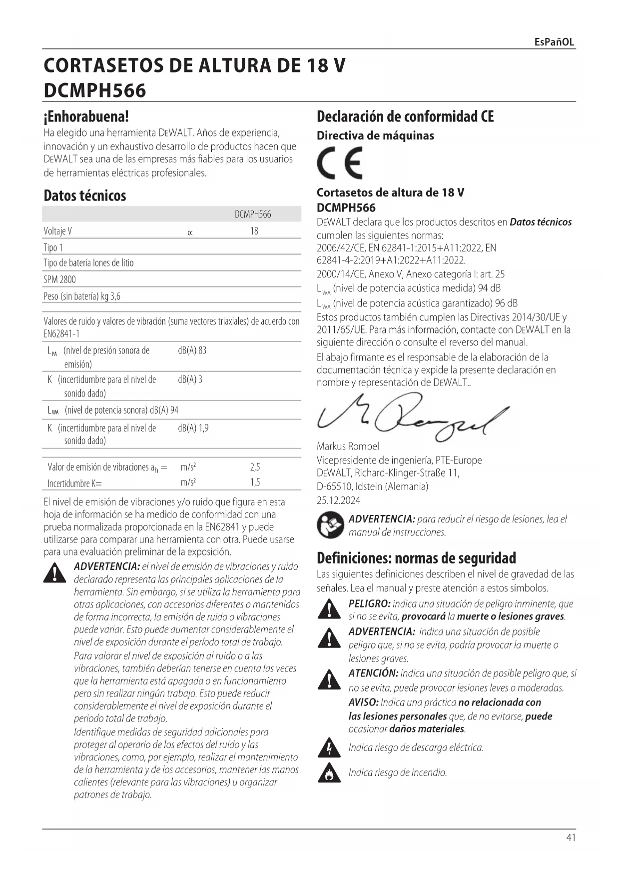 (nivel de potencia acústica garantizado) 96 dB Estos productos también cumplen las Directivas 2014/30/UE y 2011/65/UE. Para más información, contacte con DeWALT en la siguiente dirección o consulte el reverso del manual. El abajo firmante es el responsable de la elaboración de la documentación técnica y expide la presente declaración en nombre y representación de DeWALT.. Markus Rompel Vicepresidente de ingeniería, PTE-Europe DeWALT, Richard-Klinger-Straße 11, D-65510, Idstein (Alemania)