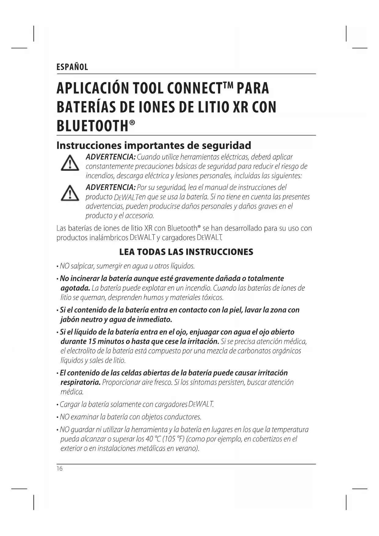 PaRa BaTERÍas DE IOnEs DE LITIO XR COn BLUETOOTH® Instrucciones importantes de seguridad ADVERTENCIA: Cuando utilice herramientas eléctricas, deberá aplicar constantemente precauciones básicas de seguridad para reducir el riesgo de incendios, descarga eléctrica y lesiones personales, incluidas las siguientes: ADVERTENCIA: Por su seguridad, lea el manual de instrucciones del producto DEWALT en que se usa la batería. Si no tiene en cuenta las presentes advertencias, pueden producirse daños personales y daños graves en el producto y el accesorio. Las baterías de iones de litio XR con Bluetooth® se han desarrollado para su uso con productos inalámbricos DeWALT y cargadores DeWALT