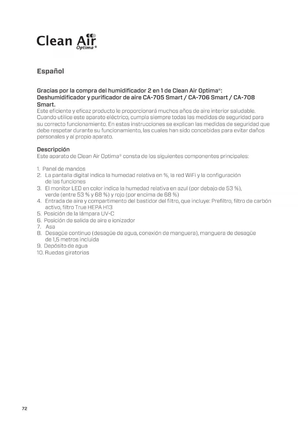 deshumidificador CA-705 Smart / CA-706 Smart / CA-708 Smart de Clean Air Optima® se somete arigurosos procedimientos de prueba antes de salir de fábrica. Si en los dos primeros años apartir de la fecha de compra el producto no funciona conforme alas especificaciones, pordefectos de fábrica, el comprador tiene derecho auna reparación gratuita ola sustitución delas piezas con la presentación de esta garantía (siempre que el defecto de funcionamiento olos daños del aparato osus piezas se hayan producido durante el uso normal del mismo). Cobertura de la garantía: todas las piezas con defectos de materiales omano de obra. Duración: dos años apartir de la fecha de compra. Nuestra tarea: reparar osustituir las piezasdefectuosas. Otras condiciones Las disposiciones de esta garantía sustituyen acualquier otra garantía escrita, ya sea explícita oimplícita, por escrito uoral, incluida cualquier garantía de comerciabilidad oidoneidad para un propósito concreto. La responsabilidad máxima del fabricante no podrá sobrepasar el precio de compra pagado por el producto. En ningún caso el fabricante podrá hacerse responsable de daños especiales, incidentales, resultantes oindirectos. Esta garantía no cubre los defectos resultantes del uso omantenimiento incorrecto opoco razonable, montaje defectuoso, accidente, catástrofes naturales, embalaje incorrecto omanipulación, alteración omodificación no autorizada, anuestro criterio exclusivo. Esta garantía quedará anulada si se despega oaltera la etiqueta del número de serie.87 ¡Gracias por su atención! Comparta sus comentarios sobre el deshumidificador CA-705 Smart / CA-706 Smart / CA-708 Smart de Clean Air Optima® en: www.cleanairoptima.com Si desea consultar las preguntas frecuentes sobre el CA-705 Smart / CA-706 Smart / CA-708 Smart, vaya awww.cleanairoptima.com ybusque CA-705 Smart / CA-706 Smart / CA-708 Smart Descargue el manual de instrucciones en formato PDF en: www.cleanairoptima.com/info/manuals Puede ver todos los vídeos de los productos de Clean Air Optima® en: www.youtube.com Clean Air Optima International B.V. | David Ricardostraat 9-7 / 9-9 | 7559 SH Hengelo (ov) Países Bajos | Teléfono: +31 (0) 74 - 2670145 Clean Air Optima Germany GmbH | Enschedestraße 14 | 48529 Nordhorn | Alemania Teléfono: +49 (0) 5921 879-121 E-mail: info@cleanairoptima.com Internet: www.cleanairoptima.com88 Jednostka główna CA-705 Smart / CA-706 Smart / CA-708 Smart89 Polski Dziękujemy za zakup oczyszczacza i osuszacza powietrza Clean Air Optima® 2in1: CA-705 Smart / CA-706 Smart / CA-708 Smart. Życzymy wieloletniego korzystania z tego wydajnego i skutecznego produktu, który zapewnia zdrowe powietrze w pomieszczeniach. W celu zapewnienia prawidłowego działania niniejszego urządzenia elektrycznego podczas jego użytkowania muszą być przestrzegane wszystkie środki ostrożności. W niniejszej instrukcji obsługi opisano zasady bezpieczeństwa, których należy przestrzegać podczas użytkowania. Mają one na celu zapobieganie urazom i uniknięcie uszkodzenia urządzenia. Opis Urządzenie Clean Air Optima® składa się z poniższych elementów podstawowych.