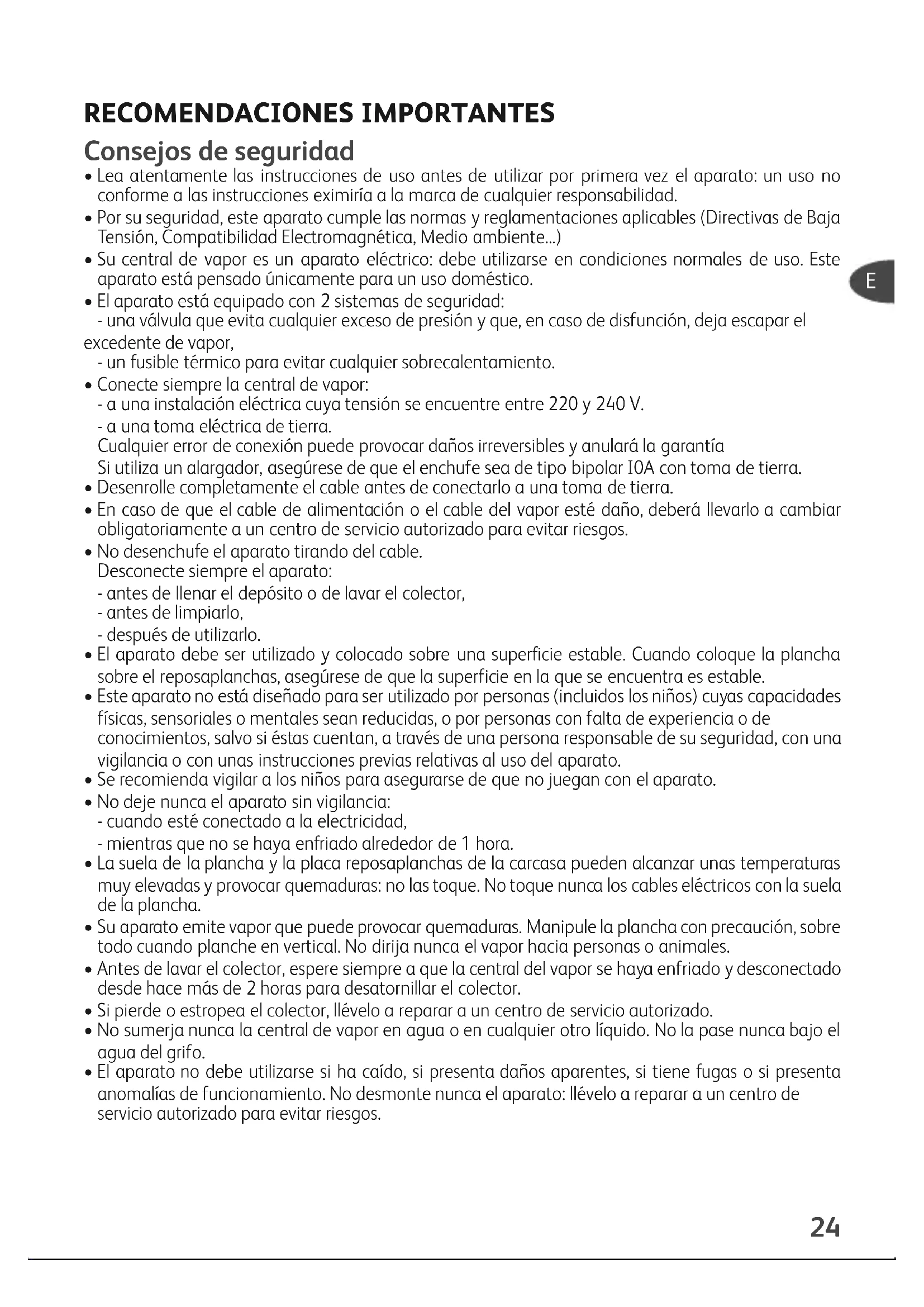 - Su central de vapor es un aparato eléctrico: debe utilizarse en condiciones normales de uso. Este aparato está pensado únicamente para un uso doméstico.