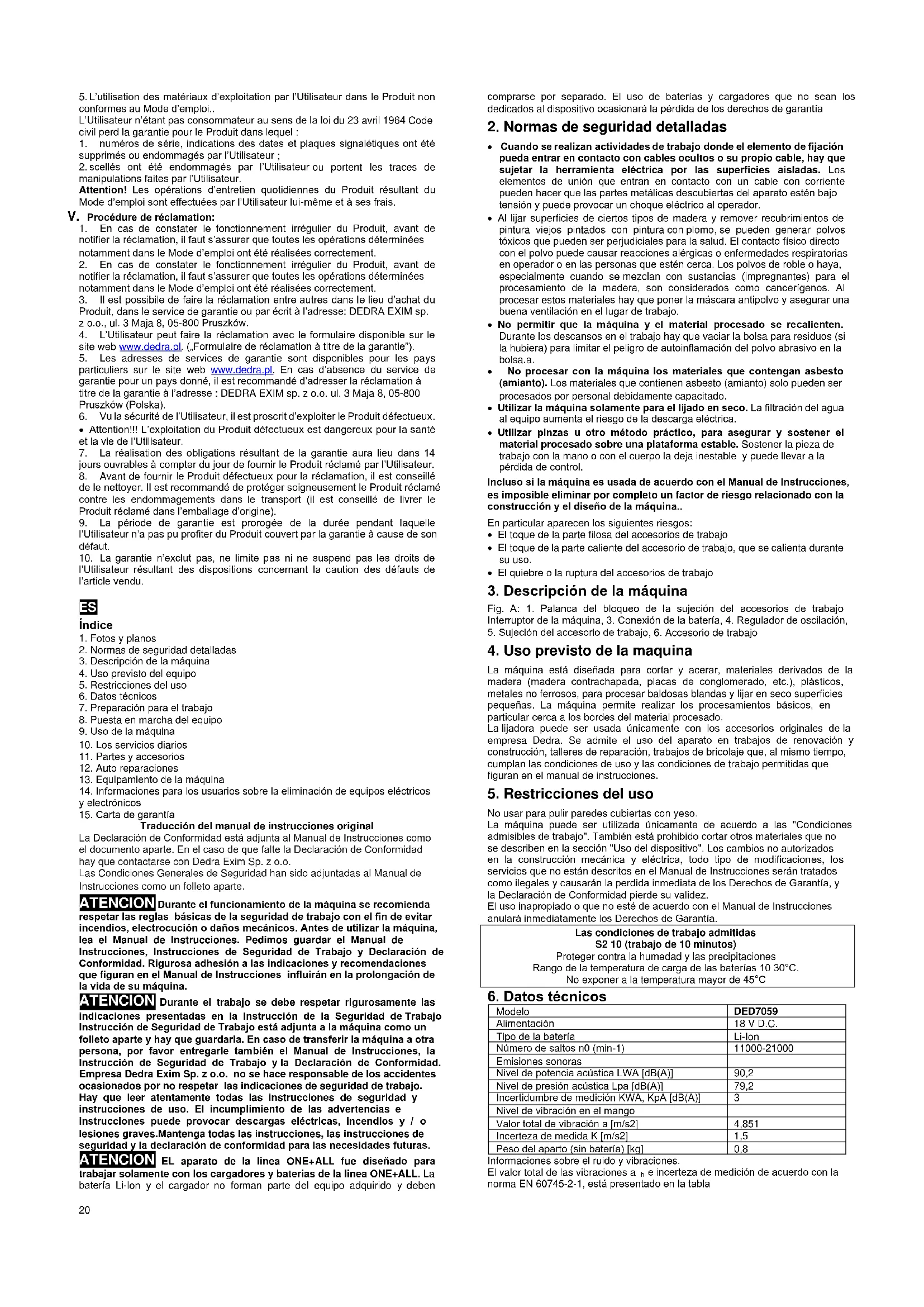 Traducción del manual de instrucciones original La Declaración de Conformidad está adjunta al Manual de Instrucciones como el documento aparte. En el caso de que falte la Declaración de Conformidad hay que contactarse con Dedra Exim Sp. z o.o. Las Condiciones Generales de Seguridad han sido adjuntadas al Manual de Instrucciones como un folleto aparte. ATENCION Durante el funcionamiento de la máquina se recomienda respetar las reglas básicas de la seguridad de trabajo con el fin de evitar incendios, electrocución o daños mecánicos. Antes de utilizar la máquina, lea el Manual de Instrucciones. Pedimos guardar el Manual de Instrucciones, Instrucciones de Seguridad de Trabajo y Declaración de Conformidad. Rigurosa adhesión a las indicaciones y recomendaciones que figuran en el Manual de Instrucciones influirán en la prolongación de la vida de su máquina. ATENCION Durante el trabajo se debe respetar rigurosamente las indicaciones presentadas en la Instrucción de la Seguridad de Trabajo Instrucción de Seguridad de Trabajo está adjunta a la máquina como un folleto aparte y hay que guardarla. En caso de transferir la máquina a otra persona, por favor entregarle también el Manual de Instrucciones, la Instrucción de Seguridad de Trabajo y la Declaración de Conformidad. Empresa Dedra Exim Sp. z o.o. no se hace responsable de los accidentes ocasionados por no respetar las indicaciones de seguridad de trabajo. Hay que leer atentamente todas las instrucciones de seguridad y instrucciones de uso. El incumplimiento de las advertencias e instrucciones puede provocar descargas eléctricas, incendios y / o lesiones graves.Mantenga todas las instrucciones, las instrucciones de seguridad y la declaración de conformidad para las necesidades futuras. ATENCION EL aparato de la linea ONE+ALL fue diseñado para trabajar solamente con los cargadores y baterias de la linea ONE+ALL. La batería Li-lon y el cargador no forman parte del equipo adquirido y deben comprarse por separado. El uso de baterías y cargadores que no sean los dedicados al dispositivo ocasionará la pérdida de los derechos de garantía