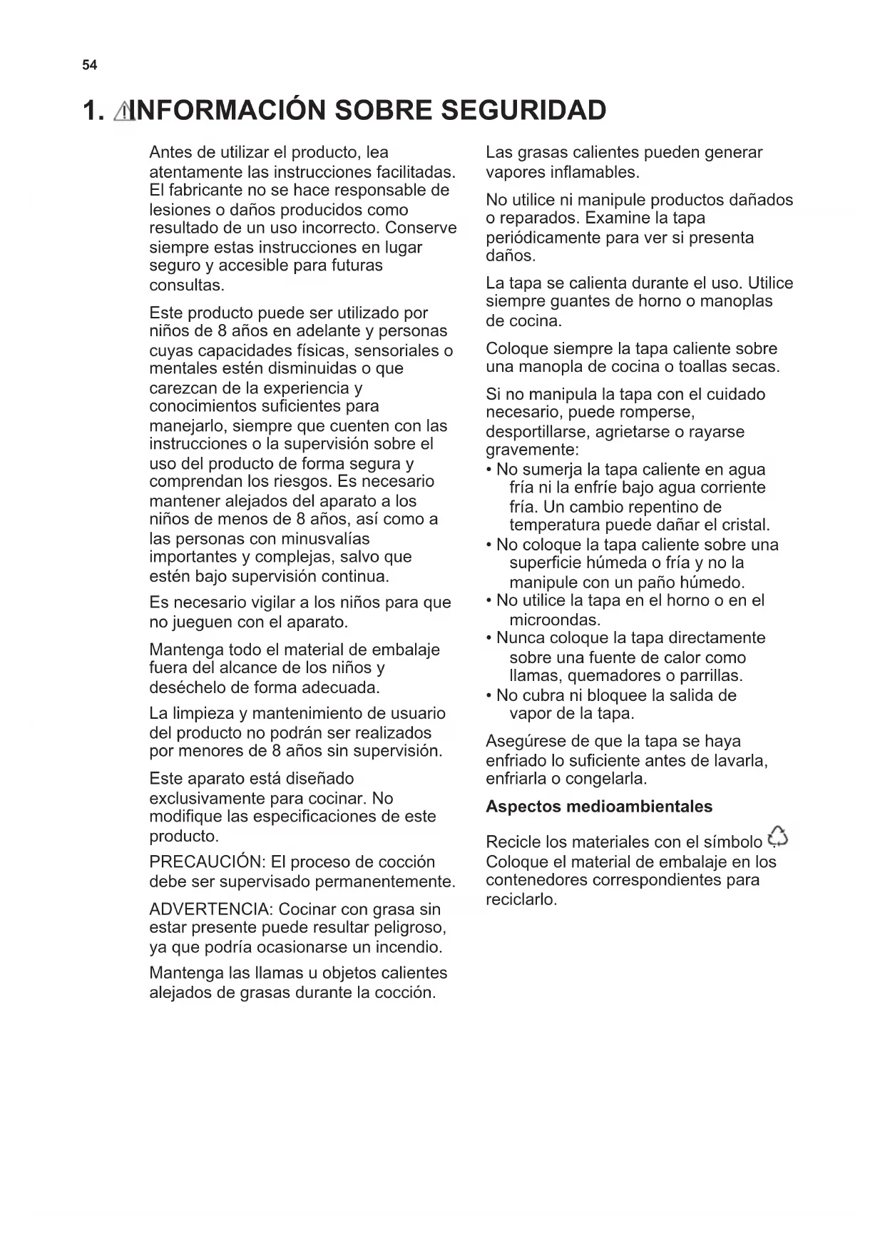 Antes de utilizar el producto, lea atentamente las instrucciones facilitadas. El fabricante no se hace responsable de lesiones o daños producidos como resultado de un uso incorrecto. Conserve siempre estas instrucciones en lugar seguro y accesible para futuras consultas. Este producto puede ser utilizado por niños de 8 años en adelante y personas cuyas capacidades físicas, sensoriales o mentales estén disminuidas o que carezcan de la experiencia y conocimientos suficientes para manejarlo, siempre que cuenten con las instrucciones o la supervisión sobre el uso del producto de forma segura y comprendan los riesgos. Es necesario mantener alejados del aparato a los niños de menos de 8 años, así como a las personas con minusvalías importantes y complejas, salvo que estén bajo supervisión continua. Es necesario vigilar a los niños para que no jueguen con el aparato. Mantenga todo el material de embalaje fuera del alcance de los niños y deséchelo de forma adecuada. La limpieza y mantenimiento de usuario del producto no podrán ser realizados por menores de 8 años sin supervisión. Este aparato está diseñado exclusivamente para cocinar. No modifique las especificaciones de este producto. PRECAUCIÓN: El proceso de cocción debe ser supervisado permanentemente. ADVERTENCIA: Cocinar con grasa sin estar presente puede resultar peligroso, ya que podría ocasionarse un incendio. Mantenga las llamas u objetos calientes alejados de grasas durante la cocción. Las grasas calientes pueden generar vapores inflamables. No utilice ni manipule productos dañados o reparados. Examine la tapa periódicamente para ver si presenta daños. La tapa se calienta durante el uso. Utilice siempre guantes de horno o manoplas de cocina. Coloque siempre la tapa caliente sobre una manopla de cocina o toallas secas. Si no manipula la tapa con el cuidado necesario, puede romperse, desportillarse, agrietarse o rayarse gravemente: