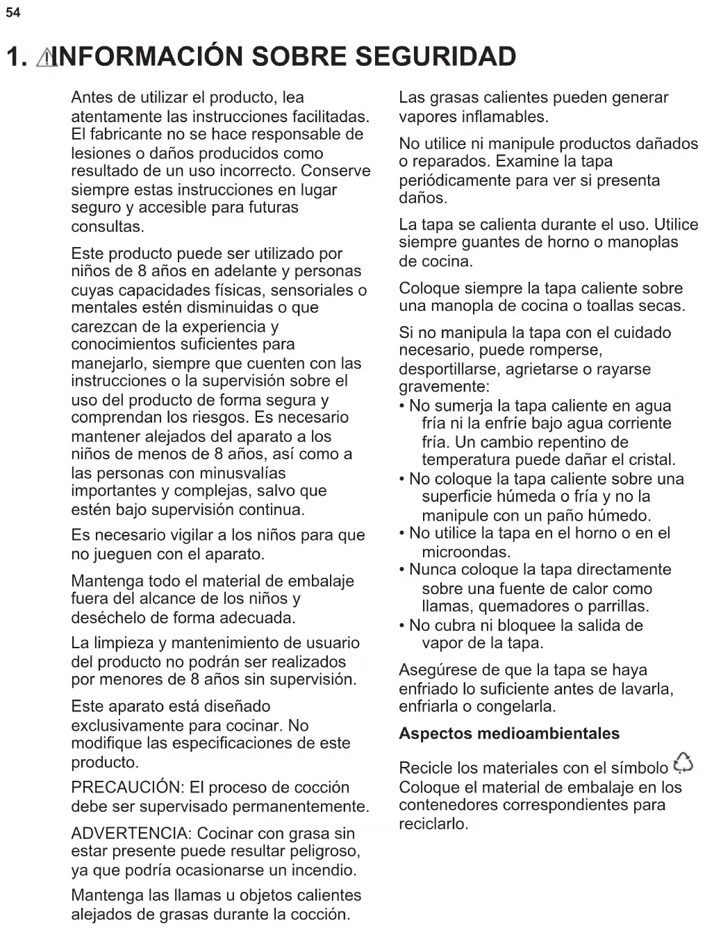 Antes de utilizar el producto, lea atentamente las instrucciones facilitadas. El fabricante no se hace responsable de lesiones o daños producidos como resultado de un uso incorrecto. Conserve siempre estas instrucciones en lugar seguro y accesible para futuras consultas. Este producto puede ser utilizado por niños de 8 años en adelante y personas cuyas capacidades físicas, sensoriales o mentales estén disminuidas o que carezcan de la experiencia y conocimientos suficientes para manejarlo, siempre que cuenten con las instrucciones o la supervisión sobre el uso del producto de forma segura y comprendan los riesgos. Es necesario mantener alejados del aparato a los niños de menos de 8 años, así como a las personas con minusvalías importantes y complejas, salvo que estén bajo supervisión continua. Es necesario vigilar a los niños para que no jueguen con el aparato. Mantenga todo el material de embalaje fuera del alcance de los niños y deséchelo de forma adecuada. La limpieza y mantenimiento de usuario del producto no podrán ser realizados por menores de 8 años sin supervisión. Este aparato está diseñado exclusivamente para cocinar. No modifique las especificaciones de este producto. PRECAUCIÓN: El proceso de cocción debe ser supervisado permanentemente. ADVERTENCIA: Cocinar con grasa sin estar presente puede resultar peligroso, ya que podría ocasionarse un incendio. Mantenga las llamas u objetos calientes alejados de grasas durante la cocción. Las grasas calientes pueden generar vapores inflamables. No utilice ni manipule productos dañados o reparados. Examine la tapa periódicamente para ver si presenta daños. La tapa se calienta durante el uso. Utilice siempre guantes de horno o manoplas de cocina. Coloque siempre la tapa caliente sobre una manopla de cocina o toallas secas. Si no manipula la tapa con el cuidado necesario, puede romperse, desportillarse, agrietarse o rayarse gravemente: