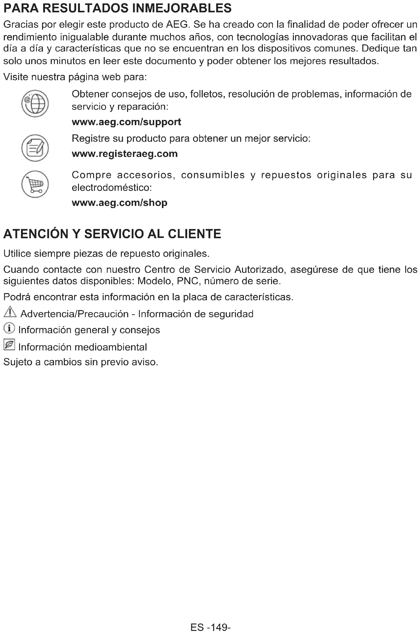 Gracias por elegir este producto de AEG. Se ha creado con la finalidad de poder ofrecer un rendimiento inigualable durante muchos años, con tecnologías innovadoras que facilitan el día a día y características que no se encuentran en los dispositivos comunes. Dedique tan solo unos minutos en leer este documento y poder obtener los mejores resultados. Visite nuestra página web para: Obtener consejos de uso, folletos, resolución de problemas, información de servicio y reparación: www.aeg.com/support Registre su producto para obtener un mejor servicio: www.registeraeg.com Compre accesorios, consumibles y repuestos originales para su electrodoméstico: www.aeg.com/shop