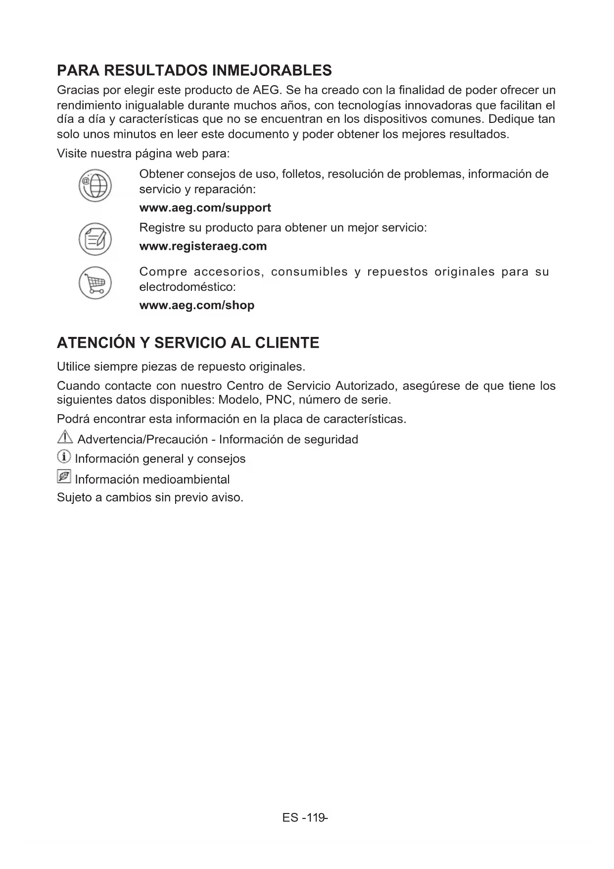 Gracias por elegir este producto de AEG. Se ha creado con la finalidad de poder ofrecer un rendimiento inigualable durante muchos años, con tecnologías innovadoras que facilitan el día a día y características que no se encuentran en los dispositivos comunes. Dedique tan solo unos minutos en leer este documento y poder obtener los mejores resultados. Visite nuestra página web para: Obtener consejos de uso, folletos, resolución de problemas, información de servicio y reparación: www.aeg.com/support Registre su producto para obtener un mejor servicio: www.registeraeg.com Compre accesorios, consumibles y repuestos originales para su electrodoméstico: www.aeg.com/shop