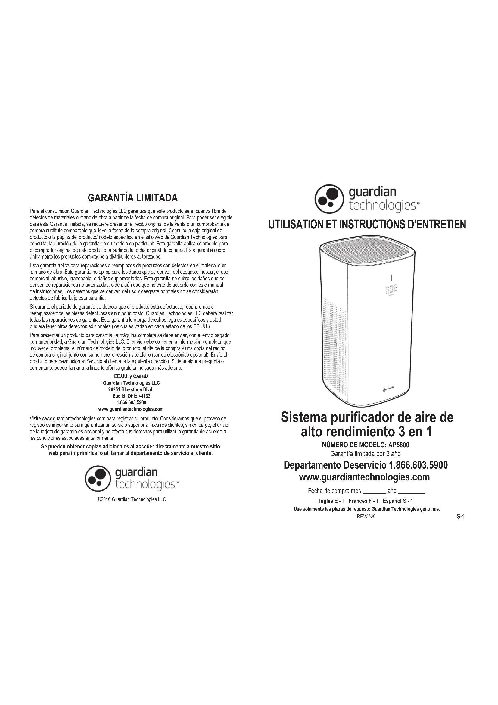 Se pueden obtener copias adicionales al acceder directamente a nuestro sitio web para imprimirlas, o al llamar al departamento de servicio al cliente.©2016 Guardian Technologies LLCPara el consumidor, Guardian Technologies LLC garantiza que este producto se encuentra libre de defectos de materiales o mano de obra a partir de la fecha de compra original. Para poder ser elegible para esta Garantía limitada, se requiere presentar el recibo original de la venta o un comprobante de compra sustituto comparable que lleve la fecha de la compra original. Consulte la caja original del producto o la página del producto/modelo específico en el sitio web de Guardian Technologies para consultar la duración de la garantía de su modelo en particular. Esta garantía aplica solamente para el comprador original de este producto, a partir de la fecha original de compra. Esta garantía cubre únicamente los productos comprados a distribuidores autorizados.Esta garantía aplica para reparaciones o reemplazos de productos con defectos en el material o en la mano de obra. Esta garantía no aplica para los daños que se deriven del desgaste inusual; el uso comercial, abusivo, irrazonable, o daños suplementarios. Esta garantía no cubre los daños que se deriven de reparaciones no autorizadas, o de algún uso que no esté de acuerdo con este manual de instrucciones. Los defectos que se deriven del uso y desgaste normales no se considerarán defectos de fábrica bajo esta garantía.Si durante el período de garantía se detecta que el producto está defectuoso, repararemos o reemplazaremos las piezas defectuosas sin ningún costo. Guardian Technologies LLC deberá realizar todas las reparaciones de garantía. Esta garantía le otorga derechos legales específicos y usted pudiera tener otros derechos adicionales (los cuales varían en cada estado de los EE.UU.)Para presentar un producto para garantía, la máquina completa se debe enviar, con el envío pagado con anterioridad, a Guardian Technologies LLC. El envío debe contener la información completa, que incluye: el problema, el número de modelo del producto, el día de la compra y una copia del recibo de compra original, junto con su nombre, dirección y teléfono (correo electrónico opcional). Envíe el producto para devolución a: Servicio al cliente, a la siguiente dirección. Si tiene alguna pregunta o comentario, puede llamar a la línea telefónica gratuita indicada más adelante. EE.UU. y CanadáGuardian Technologies LLC26251 Bluestone Blvd.Euclid, Ohio 441321.866.603.5900www.guardiantechnologies.comVisite www.guardiantechnologies.com para registrar su producto. Consideramos que el proceso de registro es importante para garantizar un servicio superior a nuestros clientes; sin embargo, el envío de la tarjeta de garantía es opcional y no afecta sus derechos para utilizar la garantía de acuerdo a las condiciones estipuladas anteriormente.S-2 S-3