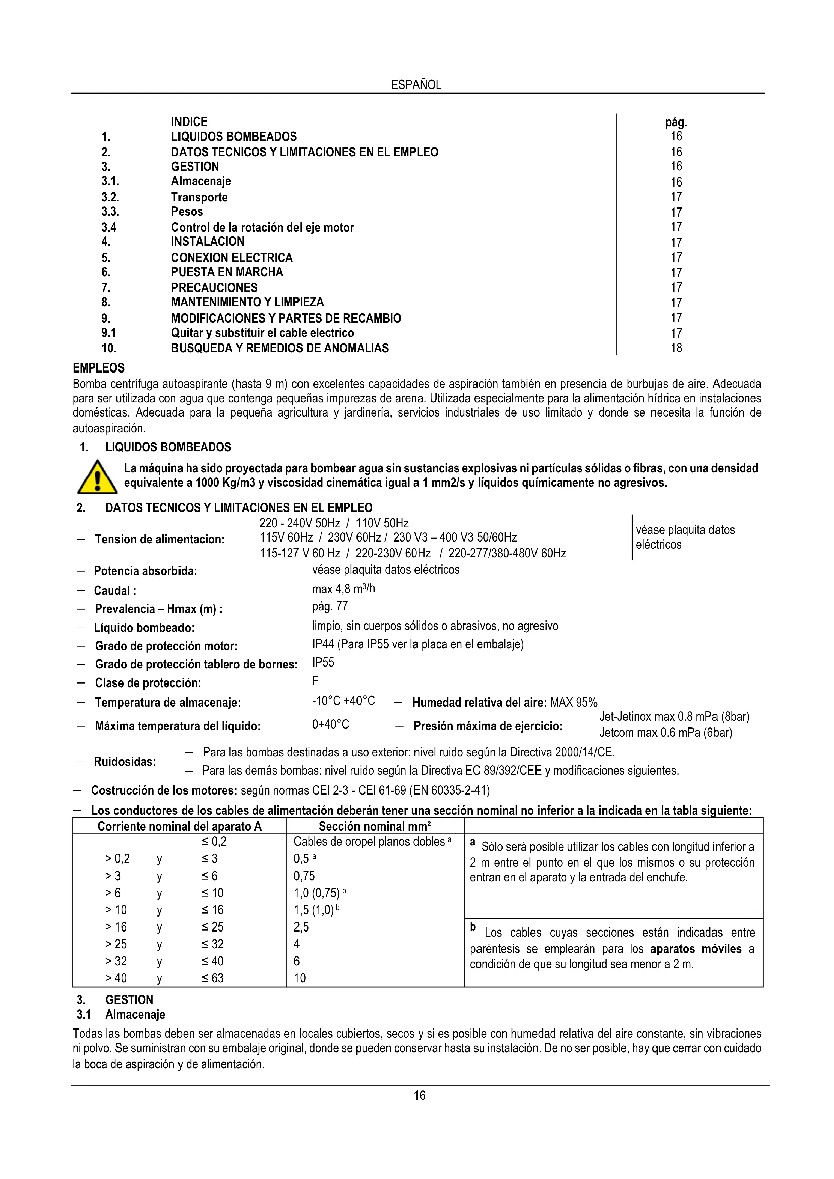 Para las demás bombas: nivel ruido según la Directiva EC 89/392/CEE y modificaciones siguientes. − Costrucción de los motores: según normas CEI 2-3 - CEI 61-69 (EN 60335-2-41) − Los conductores de los cables de alimentación deberán tener una sección nominal no inferior a la indicada en la tabla siguiente: Corriente nominal del aparato A Sección nominal mm²