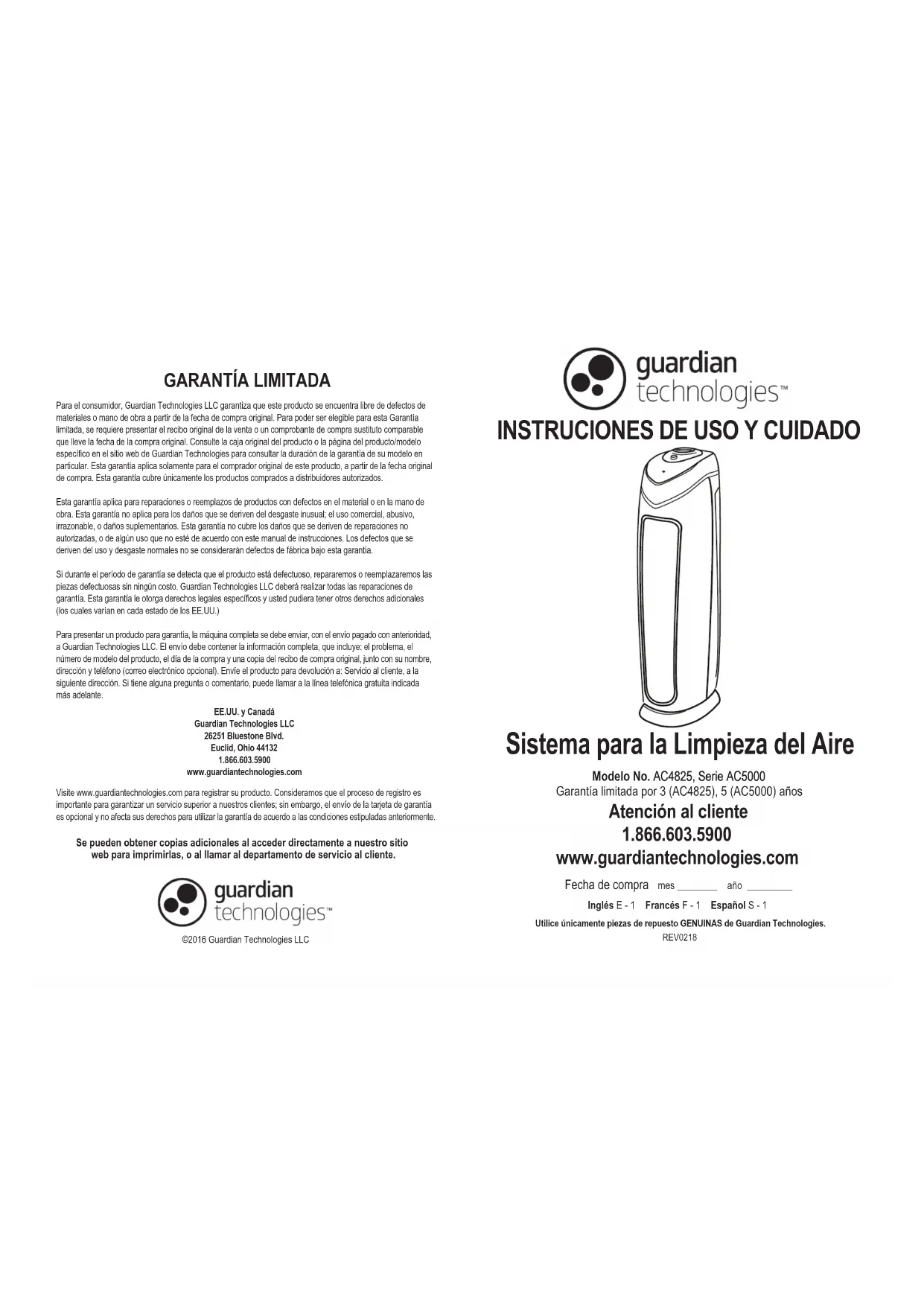 IMPORTANT: Le tube UVC doit être remplacé tous les 10 à 12 mois, selon l’usage. Lisez ce qui suit pour le reste des instructions sur la manière d’installer et de retirer le tube UVC pour les séries AC4825 et AC5000. F-8 F-9 Reportez-vous au site Web pour chaque modèle de numéros CADR Débit d’air pur Comparez les performances des différents purificateurs d’air à l’aide du CADR. Premièrement, repérez la superficie de la pièce suggérée. Puis, consultez les données CADR. Plus la valeur est élevée, plus l’appareil filtre rapidement l’air. Qu’est-ce que le CADR? CADR est l’acronyme de Clean Air Delivery Rate, soit le volume d’air filtré produit par unpurificateur d’air. Le classement CADR indique l’efficacité d’un purificateur d’air dans sa filtration des particules fines, telles que la fumée de tabac et les pollens de plantes, dans une pièce.GARANTÍA LIMITADA Se pueden obtener copias adicionales al acceder directamente a nuestro sitio web para imprimirlas, o al llamar al departamento de servicio al cliente.©2016 Guardian Technologies LLCPara el consumidor, Guardian Technologies LLC garantiza que este producto se encuentra libre de defectos de materiales o mano de obra a partir de la fecha de compra original. Para poder ser elegible para esta Garantía limitada, se requiere presentar el recibo original de la venta o un comprobante de compra sustituto comparable que lleve la fecha de la compra original. Consulte la caja original del producto o la página del producto/modelo específico en el sitio web de Guardian Technologies para consultar la duración de la garantía de su modelo en particular. Esta garantía aplica solamente para el comprador original de este producto, a partir de la fecha original de compra. Esta garantía cubre únicamente los productos comprados a distribuidores autorizados.Esta garantía aplica para reparaciones o reemplazos de productos con defectos en el material o en la mano de obra. Esta garantía no aplica para los daños que se deriven del desgaste inusual; el uso comercial, abusivo, irrazonable, o daños suplementarios. Esta garantía no cubre los daños que se deriven de reparaciones no autorizadas, o de algún uso que no esté de acuerdo con este manual de instrucciones. Los defectos que se deriven del uso y desgaste normales no se considerarán defectos de fábrica bajo esta garantía.Si durante el período de garantía se detecta que el producto está defectuoso, repararemos o reemplazaremos las piezas defectuosas sin ningún costo. Guardian Technologies LLC deberá realizar todas las reparaciones de garantía. Esta garantía le otorga derechos legales específicos y usted pudiera tener otros derechos adicionales (los cuales varían en cada estado de los EE.UU.)Para presentar un producto para garantía, la máquina completa se debe enviar, con el envío pagado con anterioridad, a Guardian Technologies LLC. El envío debe contener la información completa, que incluye: el problema, el número de modelo del producto, el día de la compra y una copia del recibo de compra original, junto con su nombre, dirección y teléfono (correo electrónico opcional). Envíe el producto para devolución a: Servicio al cliente, a la siguiente dirección. Si tiene alguna pregunta o comentario, puede llamar a la línea telefónica gratuita indicada más adelante.EE.UU. y CanadáGuardian Technologies LLC26251 Bluestone Blvd.Euclid, Ohio 441321.866.603.5900www.guardiantechnologies.comVisite www.guardiantechnologies.com para registrar su producto. Consideramos que el proceso de registro es importante para garantizar un servicio superior a nuestros clientes; sin embargo, el envío de la tarjeta de garantía es opcional y no afecta sus derechos para utilizar la garantía de acuerdo a las condiciones estipuladas anteriormente.