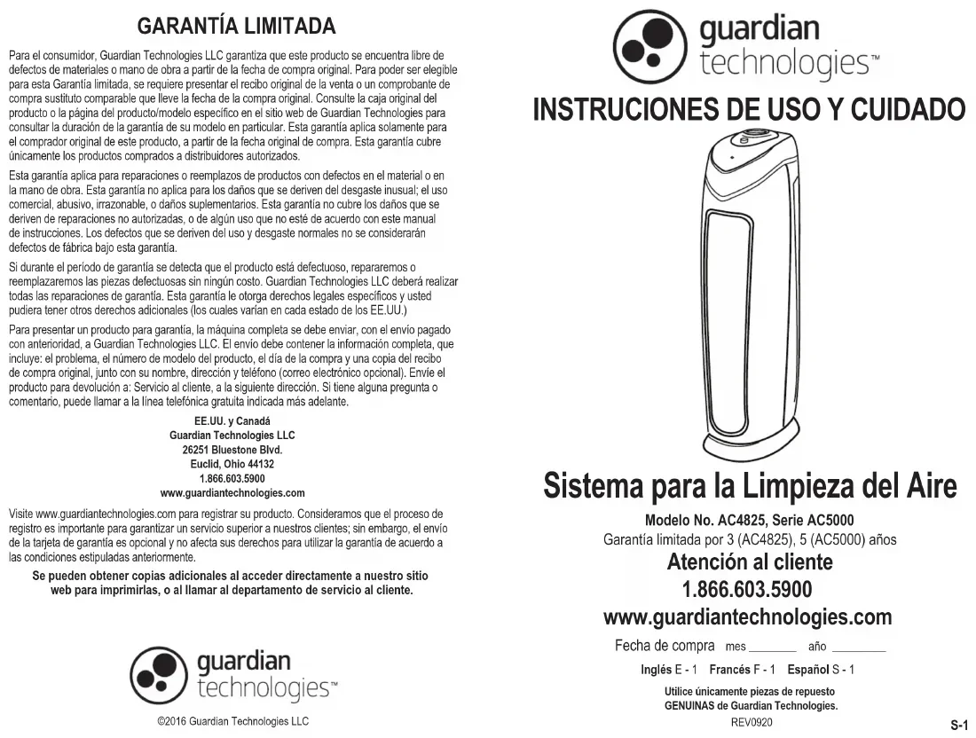 IMPORTANT: Le tube UVC doit être remplacé tous les 10 à 12 mois, selon l’usage. Lisez ce qui suit pour le reste des instructions sur la manière d’installer et de retirer le tube UVC pour les séries AC4825 et AC5000. F-8 F-9 Reportez-vous au site Web pour chaque modèle de numéros CADR Débit d’air pur Comparez les performances des différents purificateurs d’air à l’aide du CADR. Premièrement, repérez la superficie de la pièce suggérée. Puis, consultez les données CADR. Plus la valeur est élevée, plus l’appareil filtre rapidement l’air. Qu’est-ce que le CADR? CADR est l’acronyme de Clean Air Delivery Rate, soit le volume d’air filtré produit par unpurificateur d’air. Le classement CADR indique l’efficacité d’un purificateur d’air dans sa filtration des particules fines, telles que la fumée de tabac et les pollens de plantes, dans une pièce.GARANTÍA LIMITADA Se pueden obtener copias adicionales al acceder directamente a nuestro sitio web para imprimirlas, o al llamar al departamento de servicio al cliente.©2016 Guardian Technologies LLCPara el consumidor, Guardian Technologies LLC garantiza que este producto se encuentra libre de defectos de materiales o mano de obra a partir de la fecha de compra original. Para poder ser elegible para esta Garantía limitada, se requiere presentar el recibo original de la venta o un comprobante de compra sustituto comparable que lleve la fecha de la compra original. Consulte la caja original del producto o la página del producto/modelo específico en el sitio web de Guardian Technologies para consultar la duración de la garantía de su modelo en particular. Esta garantía aplica solamente para el comprador original de este producto, a partir de la fecha original de compra. Esta garantía cubre únicamente los productos comprados a distribuidores autorizados.Esta garantía aplica para reparaciones o reemplazos de productos con defectos en el material o en la mano de obra. Esta garantía no aplica para los daños que se deriven del desgaste inusual; el uso comercial, abusivo, irrazonable, o daños suplementarios. Esta garantía no cubre los daños que se deriven de reparaciones no autorizadas, o de algún uso que no esté de acuerdo con este manual de instrucciones. Los defectos que se deriven del uso y desgaste normales no se considerarán defectos de fábrica bajo esta garantía.Si durante el período de garantía se detecta que el producto está defectuoso, repararemos o reemplazaremos las piezas defectuosas sin ningún costo. Guardian Technologies LLC deberá realizar todas las reparaciones de garantía. Esta garantía le otorga derechos legales específicos y usted pudiera tener otros derechos adicionales (los cuales varían en cada estado de los EE.UU.)Para presentar un producto para garantía, la máquina completa se debe enviar, con el envío pagado con anterioridad, a Guardian Technologies LLC. El envío debe contener la información completa, que incluye: el problema, el número de modelo del producto, el día de la compra y una copia del recibo de compra original, junto con su nombre, dirección y teléfono (correo electrónico opcional). Envíe el producto para devolución a: Servicio al cliente, a la siguiente dirección. Si tiene alguna pregunta o comentario, puede llamar a la línea telefónica gratuita indicada más adelante. EE.UU. y CanadáGuardian Technologies LLC26251 Bluestone Blvd.Euclid, Ohio 441321.866.603.5900www.guardiantechnologies.comVisite www.guardiantechnologies.com para registrar su producto. Consideramos que el proceso de registro es importante para garantizar un servicio superior a nuestros clientes; sin embargo, el envío de la tarjeta de garantía es opcional y no afecta sus derechos para utilizar la garantía de acuerdo a las condiciones estipuladas anteriormente. S-1 Sistema para la Limpieza del Aire