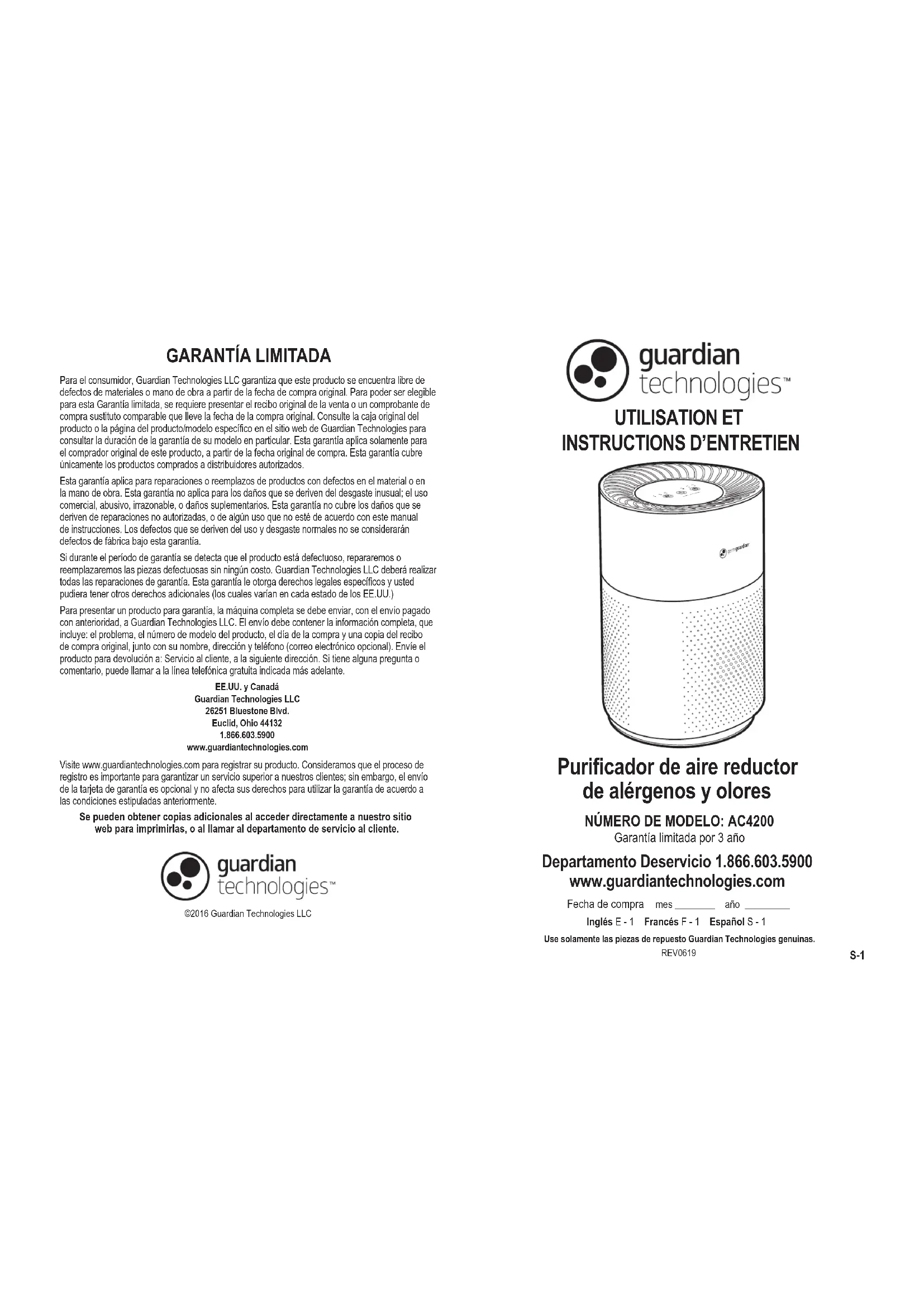 Garantía limitada por 3 año Inglés E - 1 Francés F - 1 Español S - 1 Fecha de compra mes ________ año _________ Departamento Deservicio 1.866.603.5900 www.guardiantechnologies.com Use solamente las piezas de repuesto Guardian Technologies genuinas.REV0619 Purificador de aire reductor de alérgenos y olores