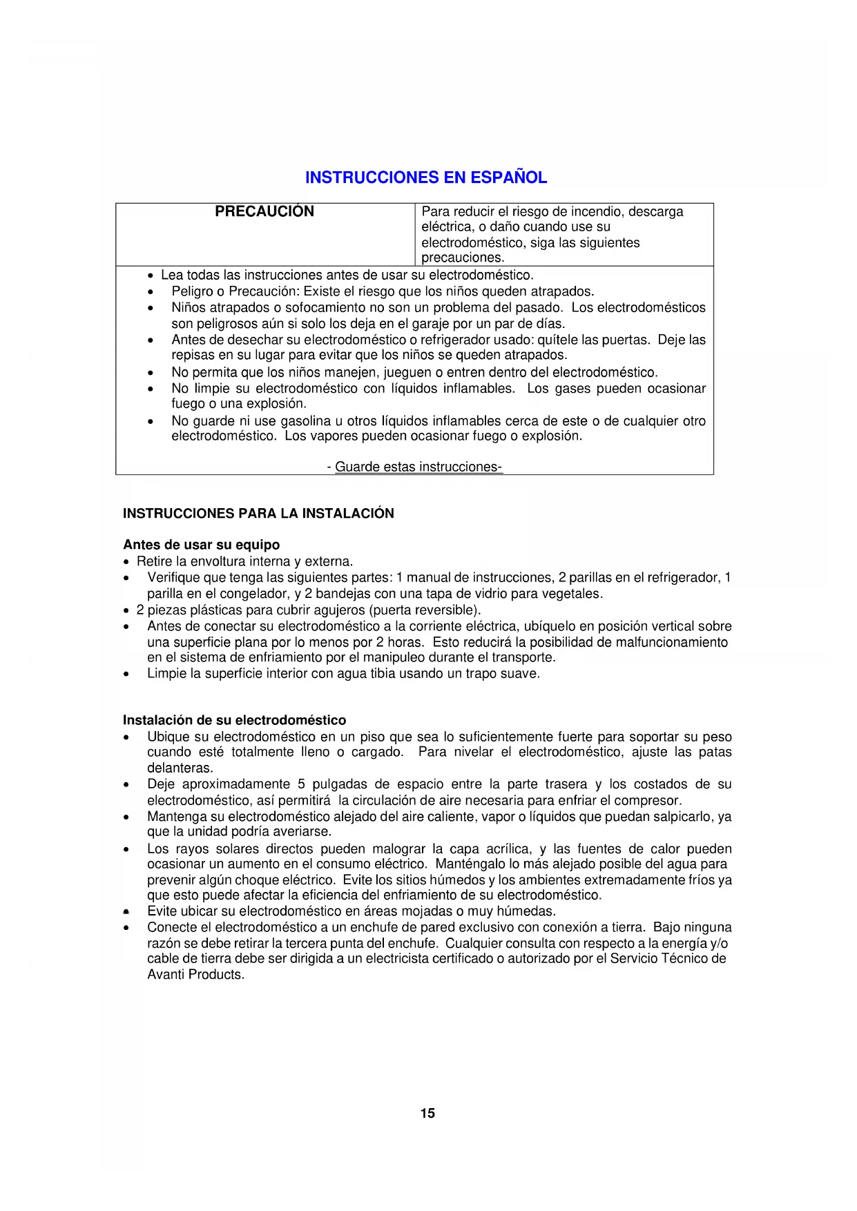 - El uso inapropiado del enchufe a tierra puede desencadenar un choque eléctrico. Consulte a personal autorizado por Avanti Products si tiene alguna duda sobre las instrucciones o si tiene alguna consulta si el electrodoméstico está correctamente instalado a la corriente eléctrica y a tierra. Si el cordón del enchufe del electrodoméstico se encuentra dañado, debe ser reemplazado por el Servicio Técnico de Avanti Products.