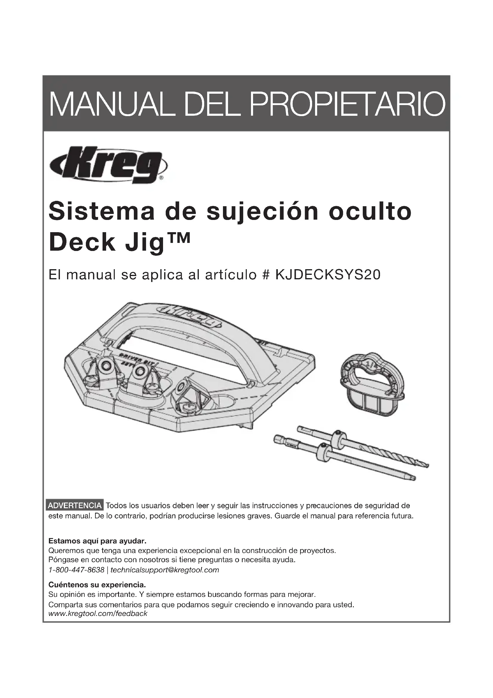 - Estamos aquí para ayudar. Queremos que tenga una experiencia excepcional en la construcción de proyectos. Póngase en contacto con nosotros si tiene preguntas o necesita ayuda. 1-800-447-8638 | technicalsupport@kregtool.com Cuéntenos su experiencia. Su opinión es importante. Y siempre estamos buscando formas para mejorar. Comparta sus comentarios para que podamos seguir creciendo e innovando para usted. www.kregtool.com/feedback ADVERTENCIA Todos los usuarios deben leer y seguir las instrucciones y precauciones de seguridad de este manual. De lo contrario, podrían producirse lesiones graves. Guarde el manual para referencia futura. Sistema de sujeción oculto Deck Jig™ El manual se aplica al artículo # KJDECKSYS2034 Precauciones de seguridad ADVERTENCIA Antes de usar una herramienta eléctrica con este producto, lea y siga las instrucciones y precauciones de seguridad del fabricante de la herramienta además de las precauciones de seguridad que se muestran a continuación para reducir el riesgo de lesiones graves por peligros tales como incendios, descargas eléctricas o una broca giratoria. ■ Siempre use el equipo de protección personal recomendado por el fabricante de la herramienta eléctrica que esté utilizando, como protección ocular, auditiva o respiratoria. ■ La broca es losa. Manipúlela con cuidado. ■ No permita que la familiaridad obtenida del uso frecuente de sus herramientas reemplace lasprácticas de seguridad laboral. Un momento de descuido es suciente para causar lesiones graves. ■ Evite las posiciones incómodas de las manos donde un deslizamiento repentino podría causar contacto con la broca giratoria. ADVERTENCIA No opere esta herramienta ni ninguna maquinaria bajo la inuencia de drogas, alcohol o medicamentos. ADVERTENCIA Este producto podría exponerlo a químicos incluidos el Acrilonitrilo y otros químicos, los cuales son conocidos por el Estado de California como causantes de cáncer ydaños reproductivos. Para obtener más información, visite www.P65Warnings.ca.gov. Índice Precauciones de seguridad p. 34