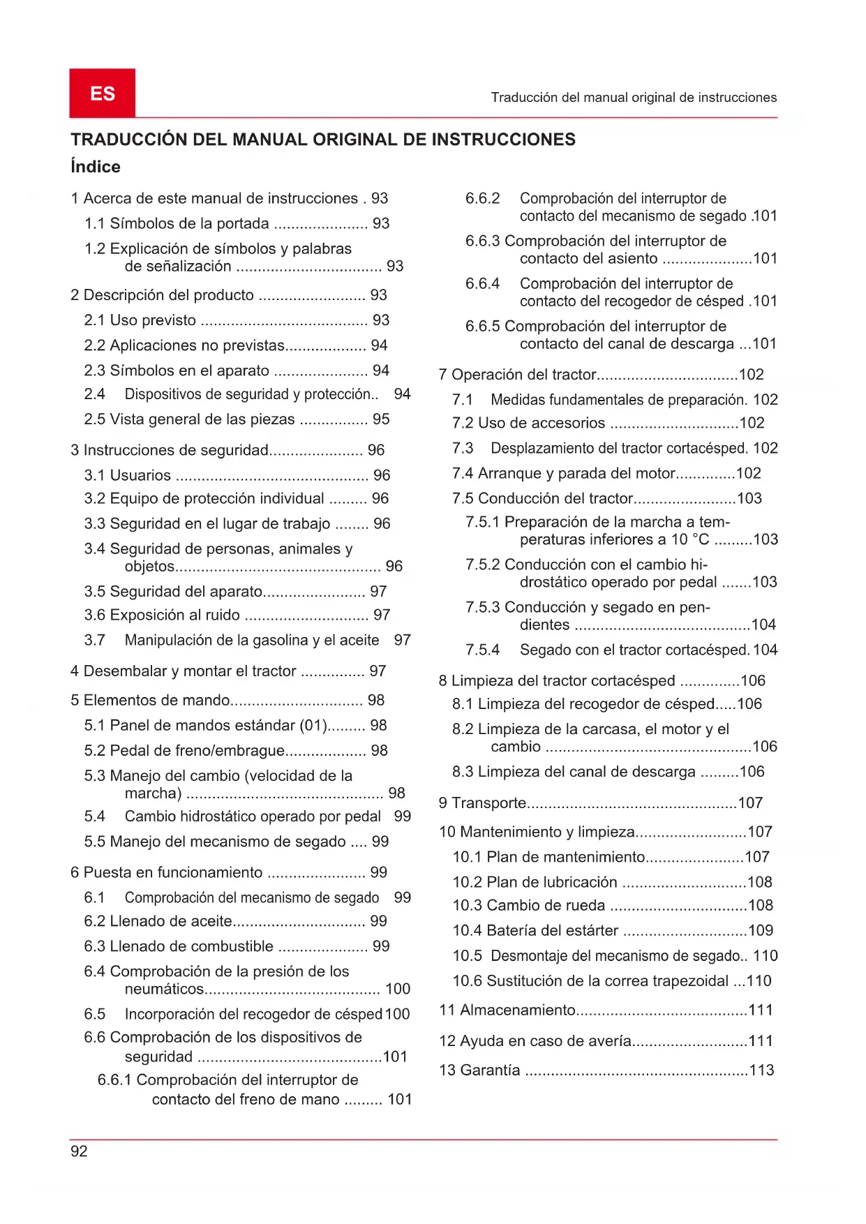 Traducción del manual original de instrucciones TRADUCCIÓN DEL MANUAL ORIGINAL DE INSTRUCCIONES Índice 1 Acerca de este manual de instrucciones . 93
