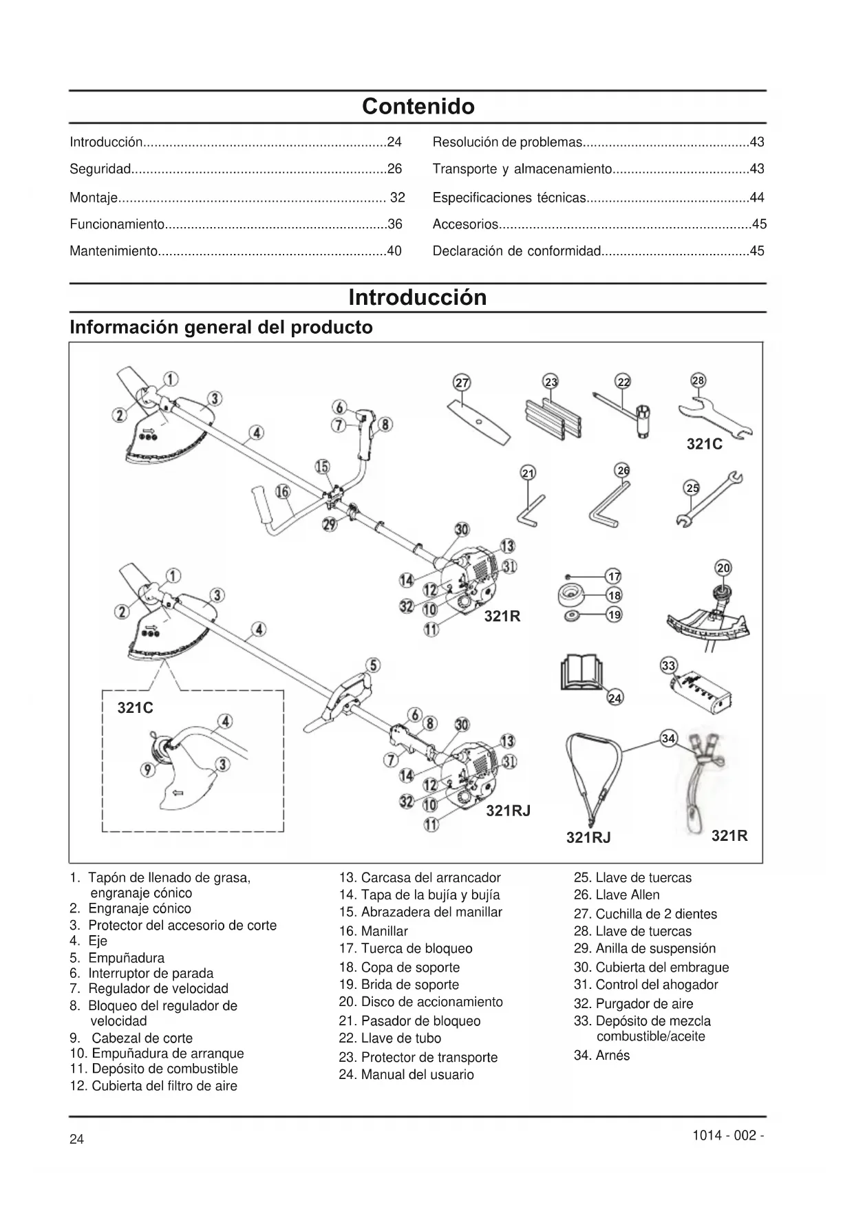 321C 241014 - 002 - Símbolos en el producto ADVERTENCIA: Este producto es peligroso. Si el producto no se utiliza con cuidado y correctamente, puede provocar lesiones e incluso la muerte al usuario o los transeúntes. Para evitar lesiones al usuario o los transeúntes, lea y respete todas las instrucciones de seguridad incluidas en el manual del usuario. Lea el manual del usuario atentamente y asegúrese de comprender las instrucciones antes de usar el producto. Este producto cumple con las directivas de la CE aplicables. Use un casco protector en lugares donde exista la posibilidad de que le caigan objetos en la cabeza. Use un equipo de protección para los oídos aprobado. Use un equipo de protección ocular aprobado. Use guantes protectores aprobados. Use botas resistentes y antideslizantes. Este producto puede hacer que los objetos salgan despedidos, lo cual puede causar lesiones (321R, 321RJ). Mantenga un mínimo de 15 m de distancia de las personas y animales durante el uso del producto. Este producto puede hacer que los objetos salgan despedidos, lo cual puede causar lesiones (321C). Velocidad máxima del eje de salida.