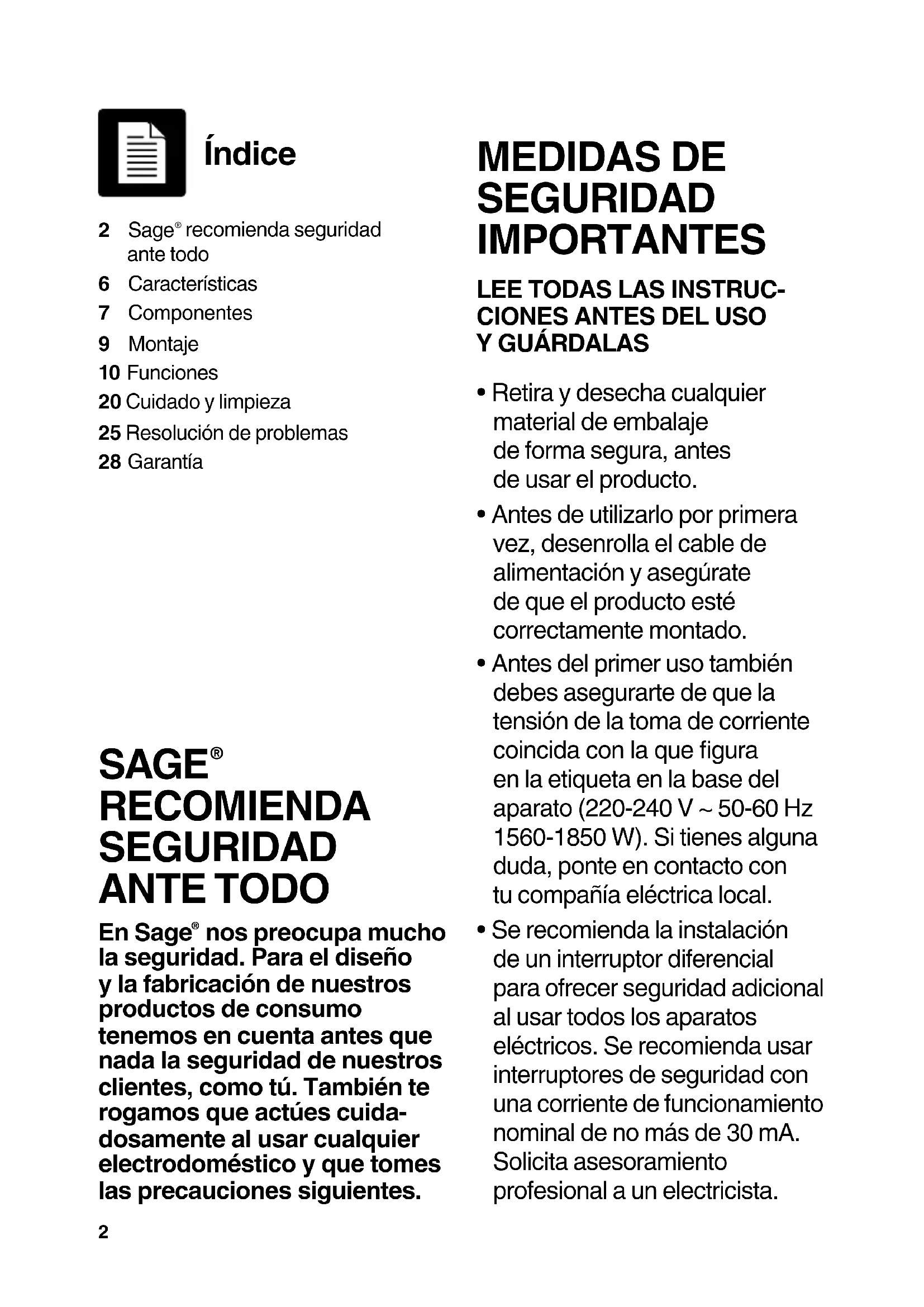- Se recomienda la instalación de un interruptor diferencial para ofrecer seguridad adicional al usar todos los aparatos eléctricos. Se recomienda usar interruptores de seguridad con una corriente de funcionamiento nominal de no más de 30 mA. Solicita asesoramiento profesional a un electricista. Índice 2 Sage