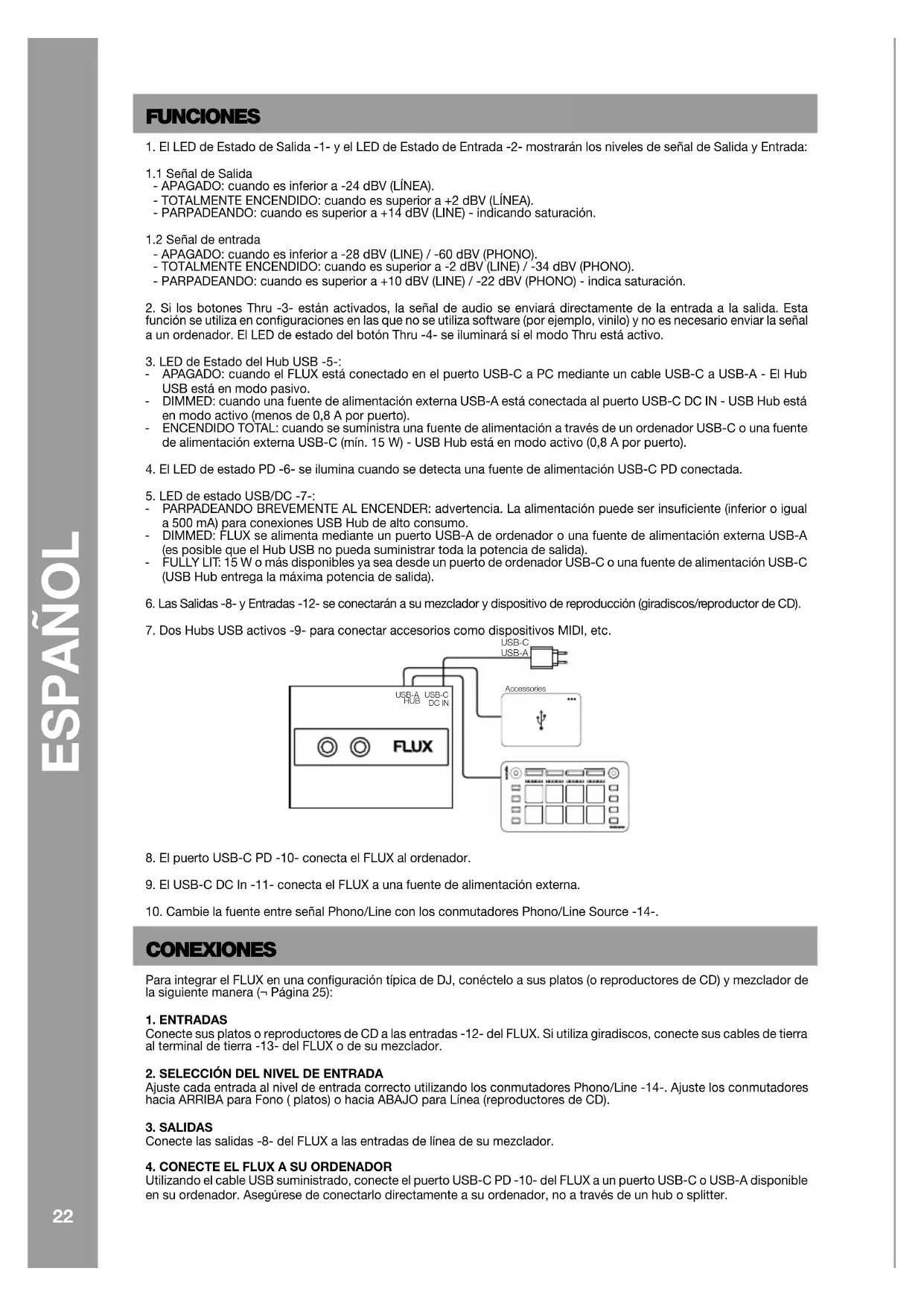 - PARPADEANDO BREVEMENTE AL ENCENDER: advertencia. La alimentación puede ser insuciente (inferior o igual a 500 mA) para conexiones USB Hub de alto consumo. - DIMMED: FLUX se alimenta mediante un puerto USB-A de ordenador o una fuente de alimentación externa USB-A (es posible que el Hub USB no pueda suministrar toda la potencia de salida). - FULLY LIT: 15 W o más disponibles ya sea desde un puerto de ordenador USB-C o una fuente de alimentación USB-C (USB Hub entrega la máxima potencia de salida). 6. Las Salidas -8- y Entradas -12- se conectarán a su mezclador y dispositivo de reproducción (giradiscos/reproductor de CD).