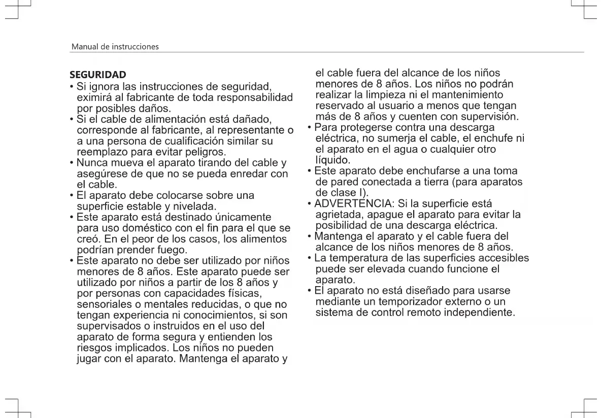 - Este aparato no debe ser utilizado por niños menores de 8 años. Este aparato puede ser utilizado por niños a partir de los 8 años y por personas con capacidades físicas, sensoriales o mentales reducidas, o que no tengan experiencia ni conocimientos, si son supervisados o instruidos en el uso del aparato de forma segura y entienden los riesgos implicados. Los niños no pueden jugar con el aparato. Mantenga el aparato y el cable fuera del alcance de los niños menores de 8 años. Los niños no podrán realizar la limpieza ni el mantenimiento reservado al usuario a menos que tengan más de 8 años y cuenten con supervisión.