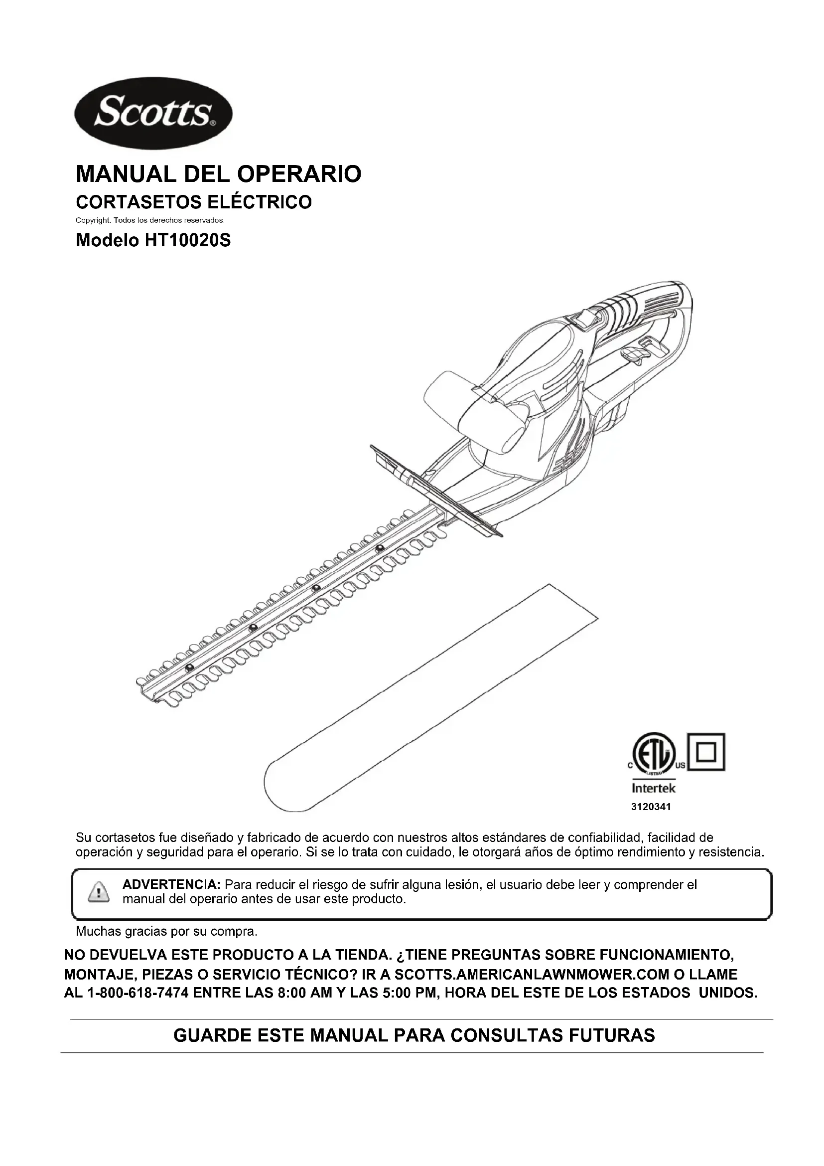 Copyright. Todos los derechos reservados. Modelo HT10020S Su cortasetos fue diseñado y fabricado de acuerdo con nuestros altos estándares de confiabilidad, facilidad de operación y seguridad para el operario. Si se lo trata con cuidado, le otorgará años de óptimo rendimiento y resistencia. ADVERTENCIA: Para reducir el riesgo de sufrir alguna lesión, el usuario debe leer y comprender el manual del operario antes de usar este producto. Muchas gracias por su compra. NO DEVUELVA ESTE PRODUCTO A LA TIENDA. ¿TIENE PREGUNTAS SOBRE FUNCIONAMIENTO, MONTAJE, PIEZAS O SERVICIO TÉCNICO? IR A SCOTTS.AMERICANLAWNMOWER.COM O LLAME AL 1-800-618-7474 ENTRE LAS 8:00 AM Y LAS 5:00 PM, HORA DEL ESTE DE LOS ESTADOS UNIDOS.