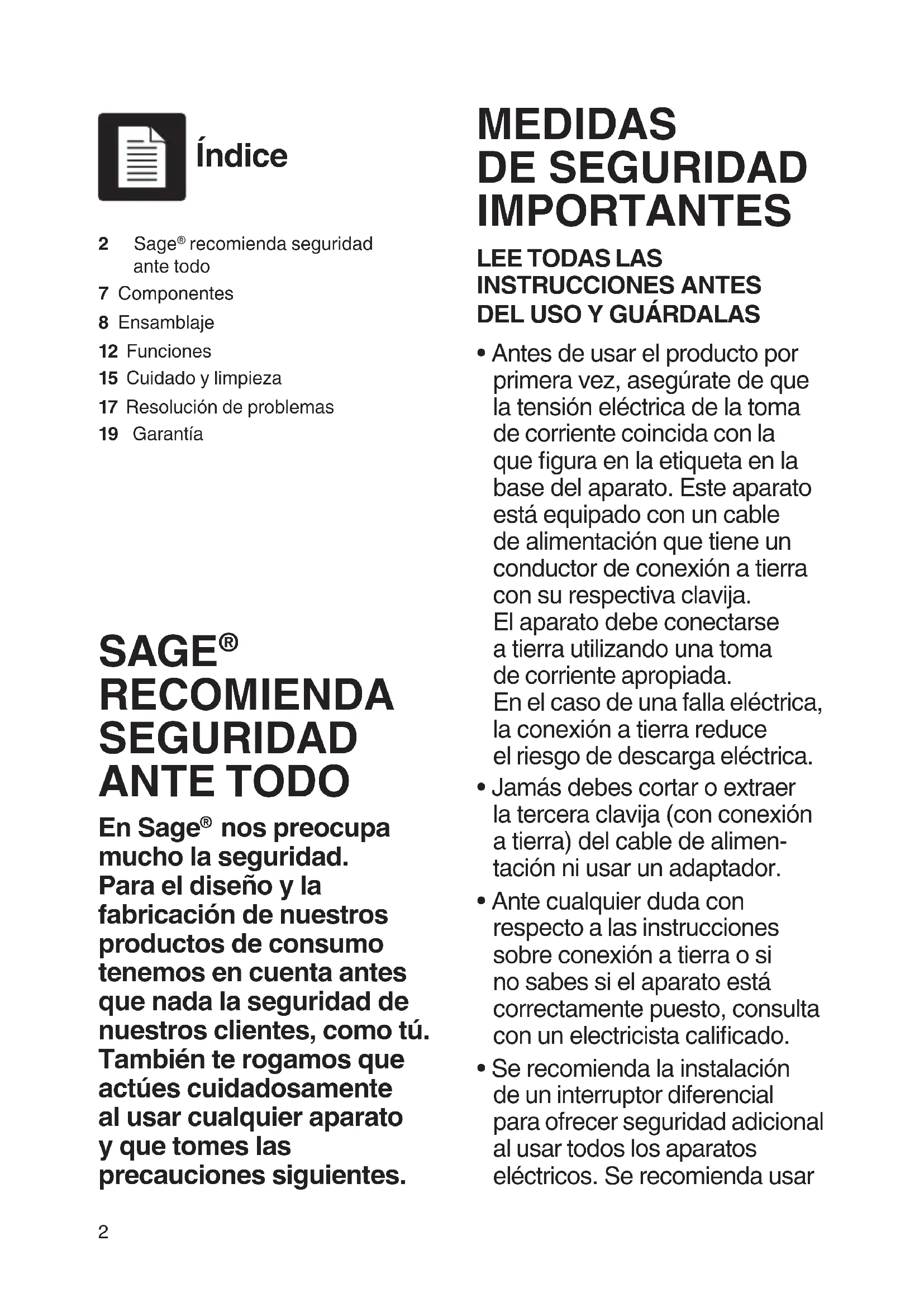 - Se recomienda la instalación de un interruptor diferencial para ofrecer seguridad adicional al usar todos los aparatos eléctricos. Se recomienda usar Índice 2 Sage recomienda seguridad ante todo7 Componentes8 Ensamblaje12 Funciones15 Cuidado y limpieza17 Resolución de problemas19 Garantía3